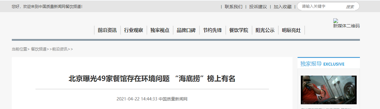 中国质量新闻网4月22日消息,近日,北京市生态环境局在第二轮市级“点穴式”执法专项行动中,检查了全市各类企业和点位164家,发现49家餐饮企业存在环境问题,包括海底捞、云海肴等知名餐饮企业。