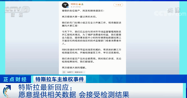 针对特斯拉车主维权事件,国家市场监管总局昨晚(21日)回应,已责成河南省、上海市等地市场监督管理部门依法维护消费者合法权益。