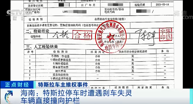 3月14日,特斯拉在其官方微博发布说明提到:邀请海南捷安通汽车检测服务有限公司对事故车辆进行了检验,检验结果显示,车辆刹车系统合格。但于女士对于她的汽车进行的这一次第三方检测并不知情。