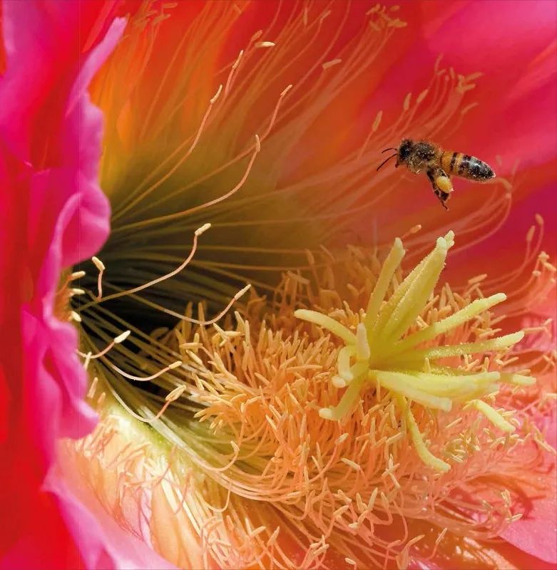 这只蜜蜂在靠近一朵仙人掌科植物的花。一次这样的觅食之旅,便可让蜜蜂往腿上的“花粉蓝”中装入大约14毫克的花粉。