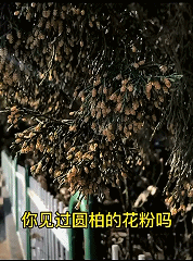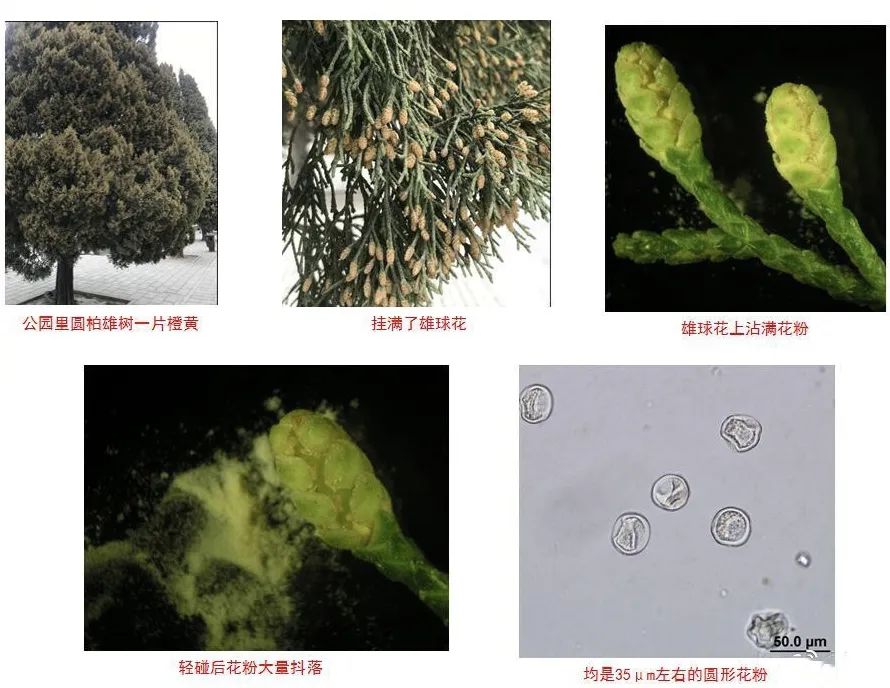 比如北京最常见的圆柏花粉,圆柏花粉是我国春季气传花粉的重要组成部分,也是北京春季花粉中的主要致敏花粉之一。每年的3月中旬到4月中旬,是圆柏雄松的花期,圆柏花粉茂盛时,远远望去就像挂满饱满的谷子。风起,一阵“黄烟”就会飘过,大量孢子释放到空中。随着树龄的增长,圆柏雄树释放的花粉会逐年增多,空气中花粉浓度持续升高。