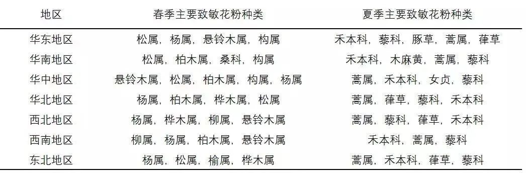 表1 中国主要致敏花粉种类(表格来源于《花粉过敏的研究进展》)
