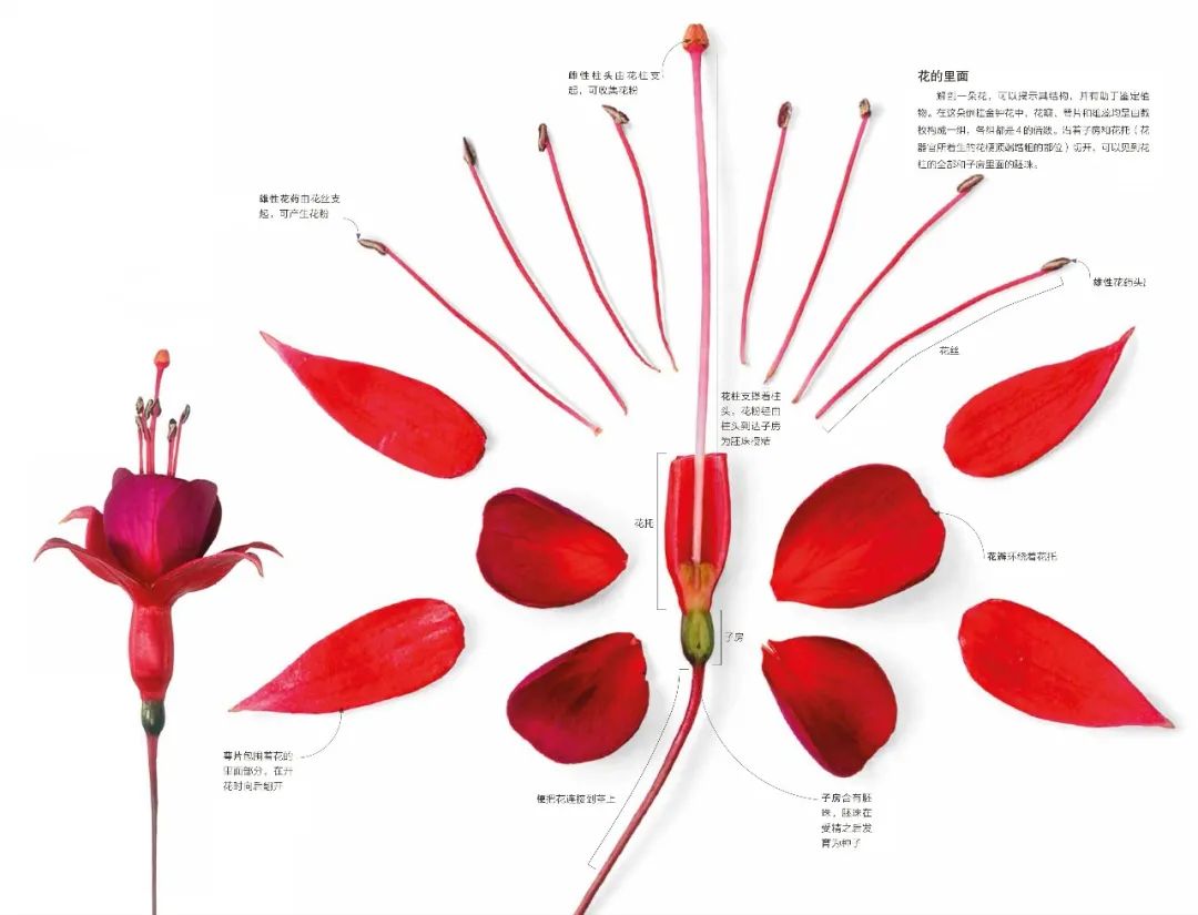 人们最熟悉的花是单独一朵的完全花。之所以说“完全”,是因为在同一朵花中既有雄性器官又有雌性器官,缺少其中任何一部分的称不完全花。将倒挂金钟的花解剖,我们可以清晰看到单朵花的构成。
