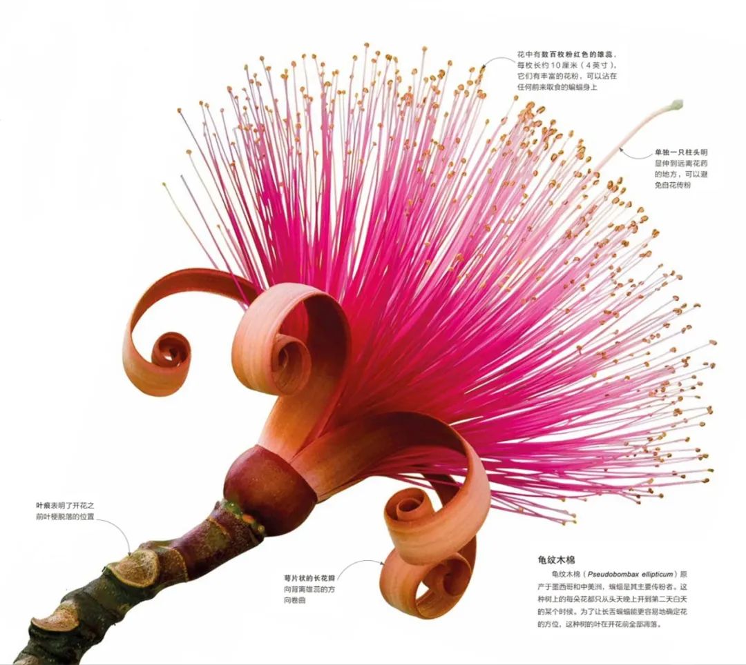 图4 花为龟纹木棉,花中有数百枚粉红色的雄蕊,它们有丰富的花粉,可以沾在任务前来取食的蝙蝠身上 图源:《DK植物大百科》