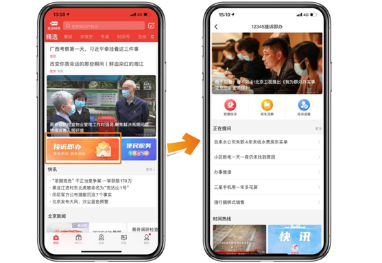 “北京时间”客户端全新上线“12345接诉即办”民生服务融媒品牌,这是“媒体+政务服务”合作模式的一种创新。用户可通过“北京时间”客户端“接诉即办”服务入口用短视频、图片更准确形象地描述投诉内容,实现一键视频投诉、实时掌握办件进展,真正实现“民有所呼 我有所应”的智慧服务功能,搭建起基层群众与政府沟通的优质网络桥梁,提升市民满意度,服务首都现代化综合治理,参与首都智慧城市建设。广大观众听众熟知的《向前一步》、《问北京》、《接诉即办》、《生活这一刻》节目也将入驻北京时间,对用户投诉内容进行“接诉跟办”,以媒体人的实际行动为百姓办实事。