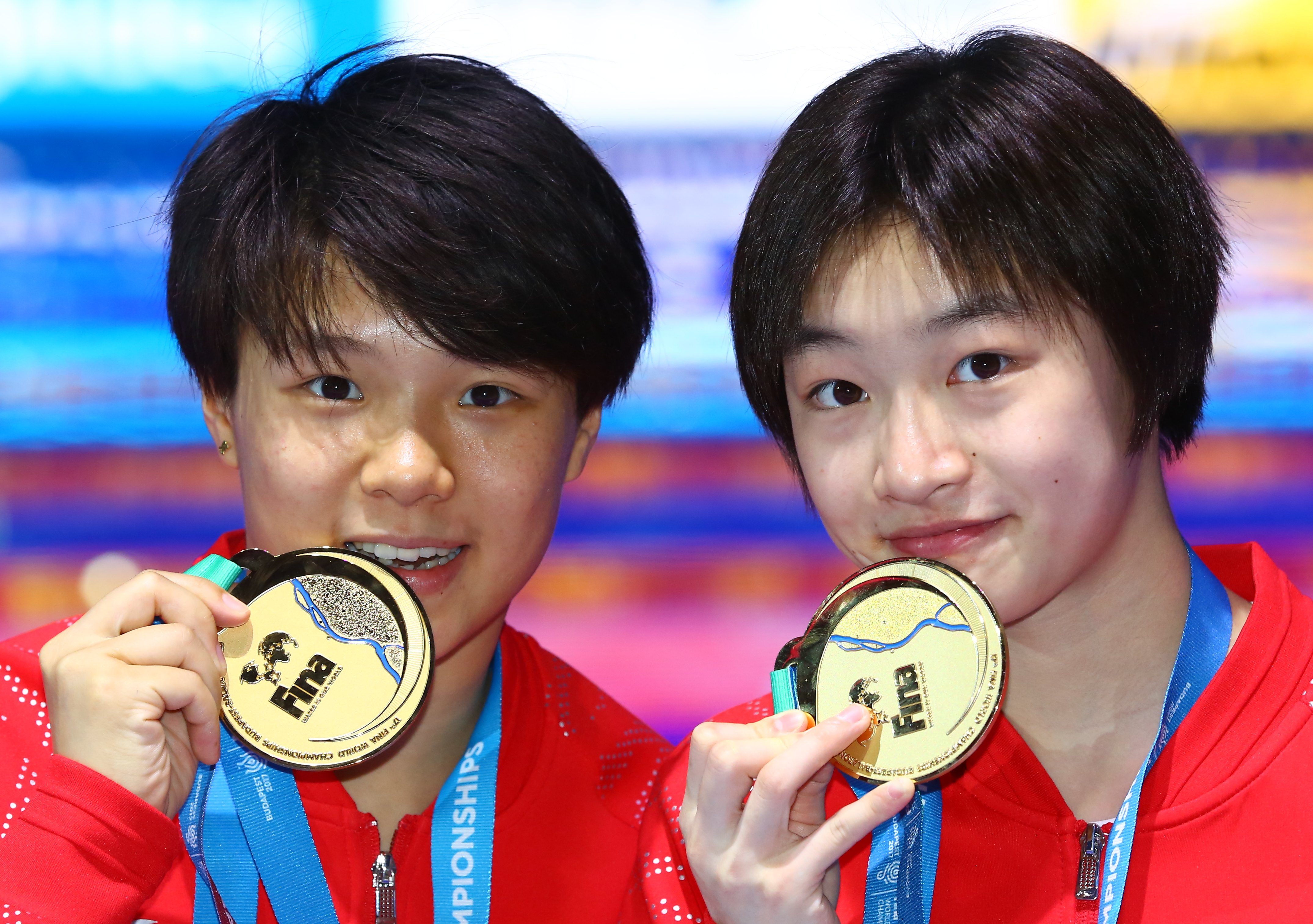 昌雅妮(右)与施廷懋联手获得布达佩斯游泳世锦赛双人3米板冠军 新华社