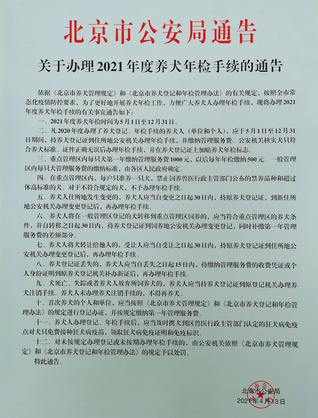 根据北京市公安局发布的《关于办理2021年度养犬年检手续的通告》,凡是在2020年度办理了养犬登记、年检手续的养犬人,应于2021年5月1日至12月31日期间,持养犬登记证到住所地公安机关办理年检手续,缴纳管理服务费。