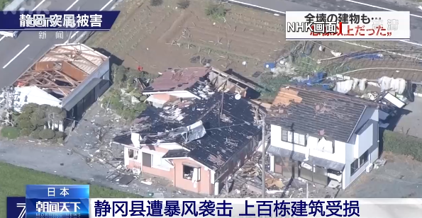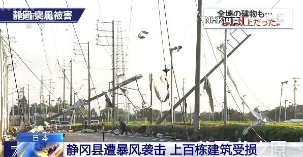 静冈县牧之原市方面2日说,当地1日傍晚6点50分左右遭暴风袭击,推测风速为每秒55米。暴风造成当地三栋建筑全毁,90多栋住宅部分受损,另有多辆卡车被吹翻、电线杆和街边树木被吹倒。