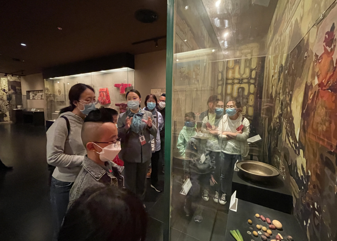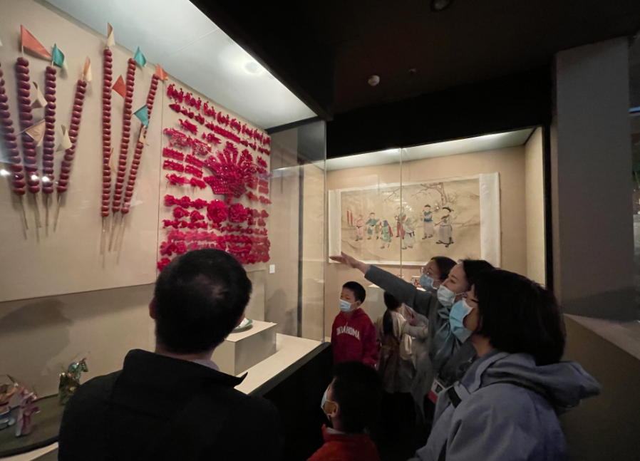 一个多小时的讲解,收获观众阵阵掌声。“原来男孩要穿虎头鞋、女孩穿猫头鞋,压岁钱要在大年三十夜里放在我们的枕头底下……”来自沈阳的男生小齐是个博物馆迷,他一路听着讲解,还不忘用爸爸的手机拍照做“笔记”,他说,“没想到老北京的习俗里,还有这么多有意思的事!”来自苏州的王先生带着儿子、女儿一起来看展,了解北京的历史文化,他说:“好动的孩子们完全被讲解员生动的讲解吸引住了。”