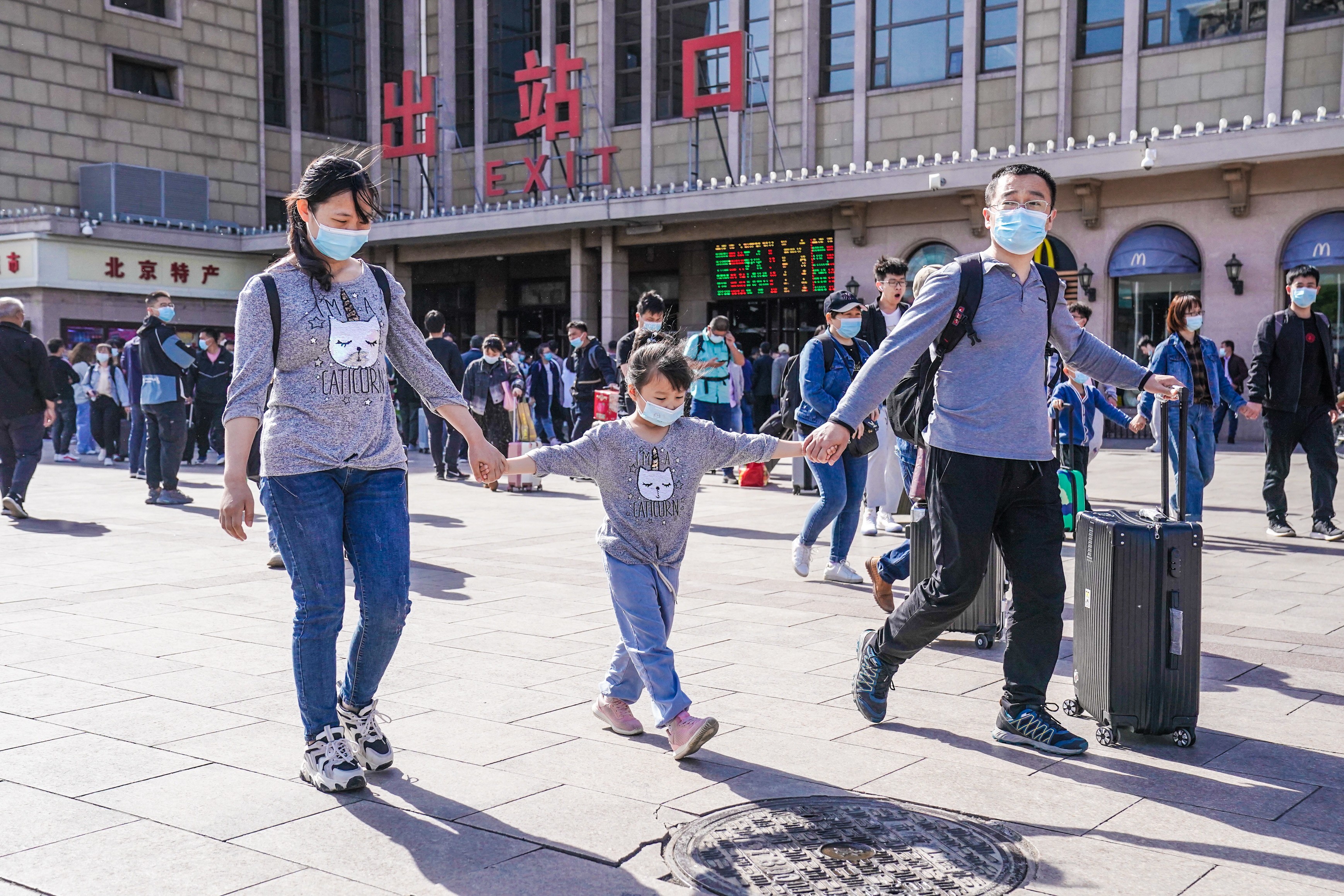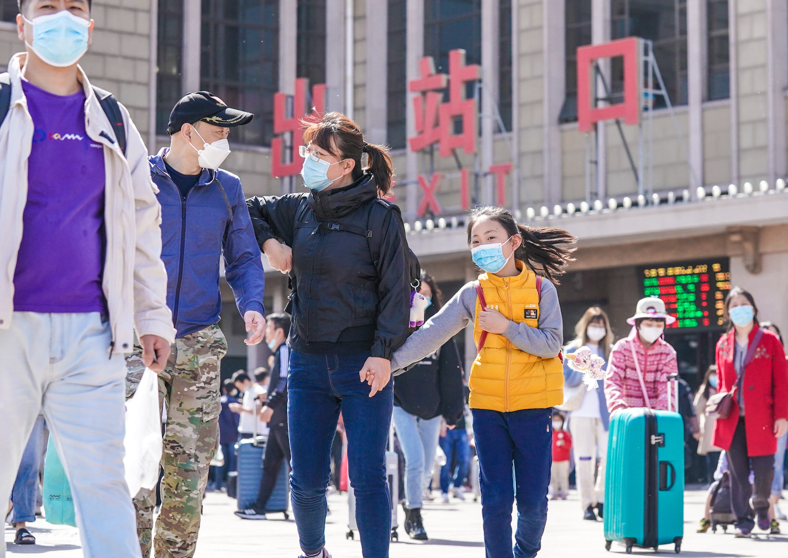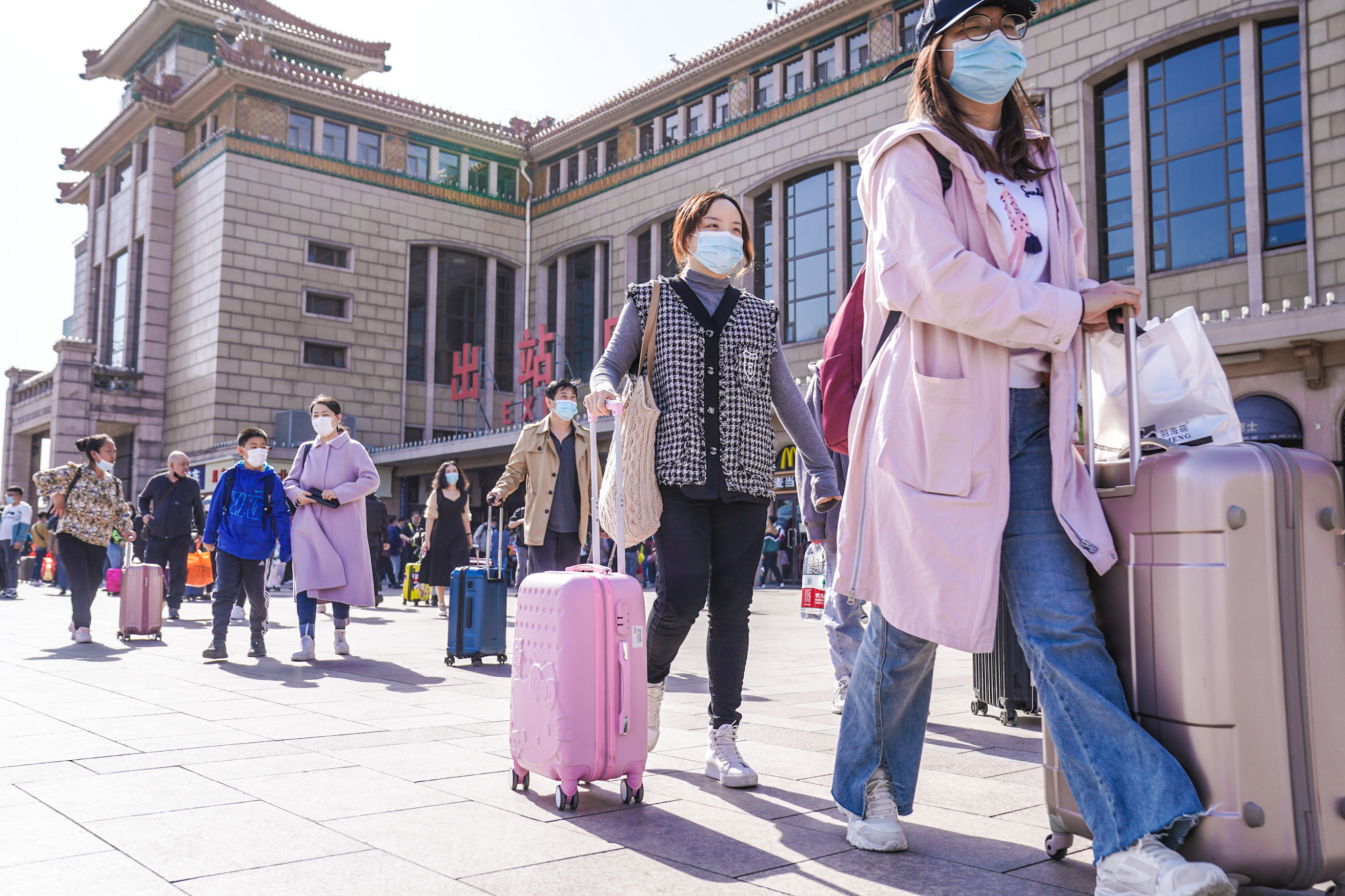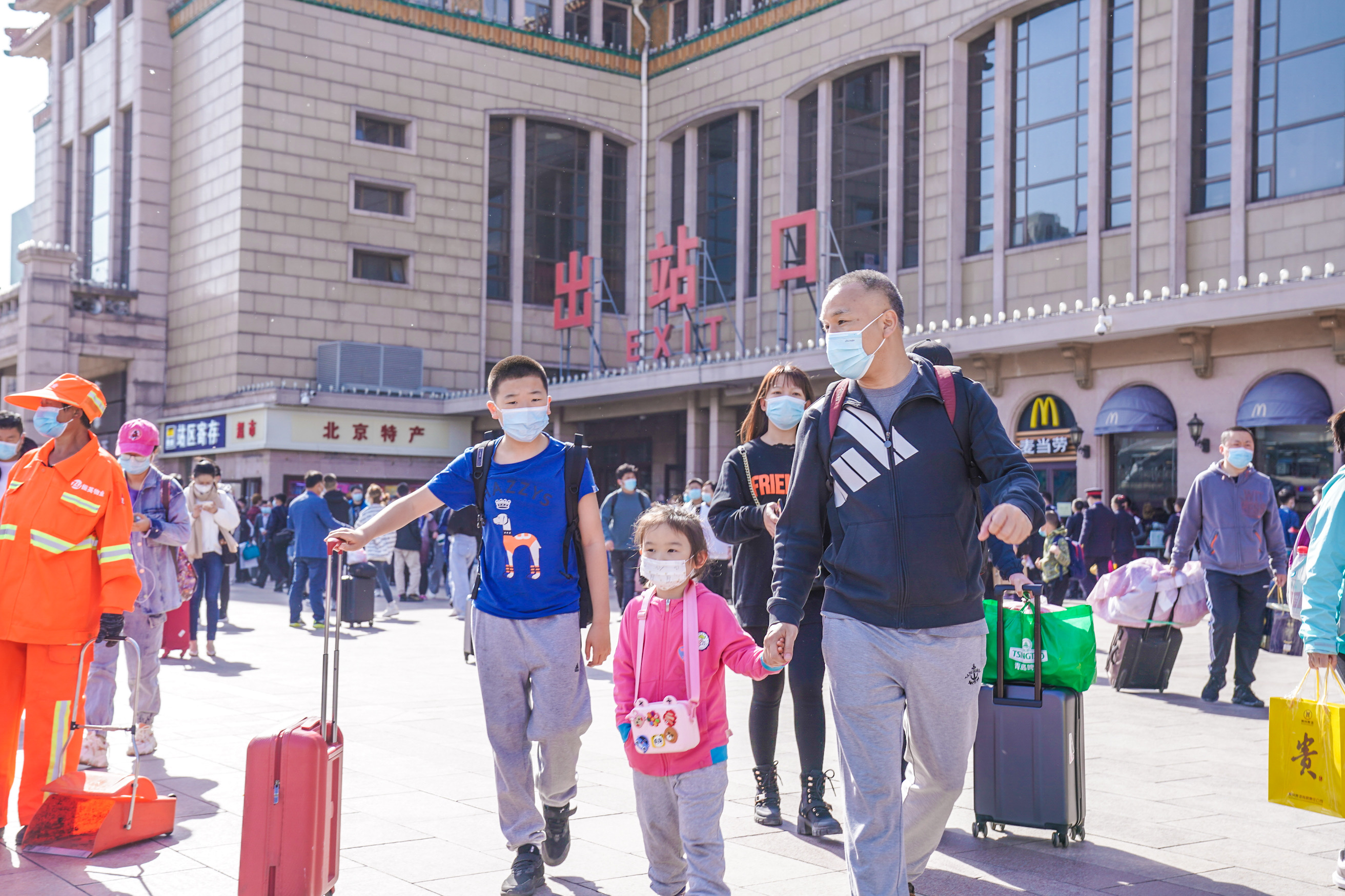 今天是五一假期最后一天,在北京站前广场,返程乘客做好防护,返程出站。 武亦彬摄