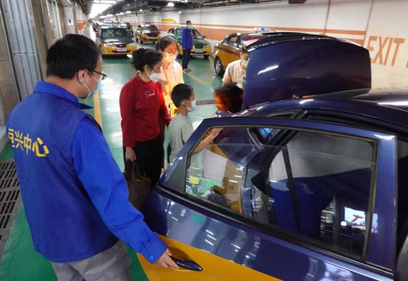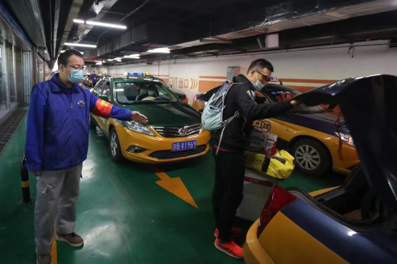 西站工作人员把每位旅客送到出租车边,防止司机拒载。 安旭东摄