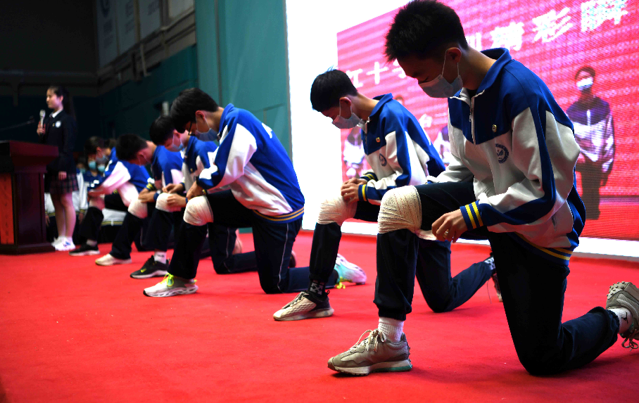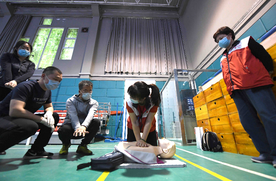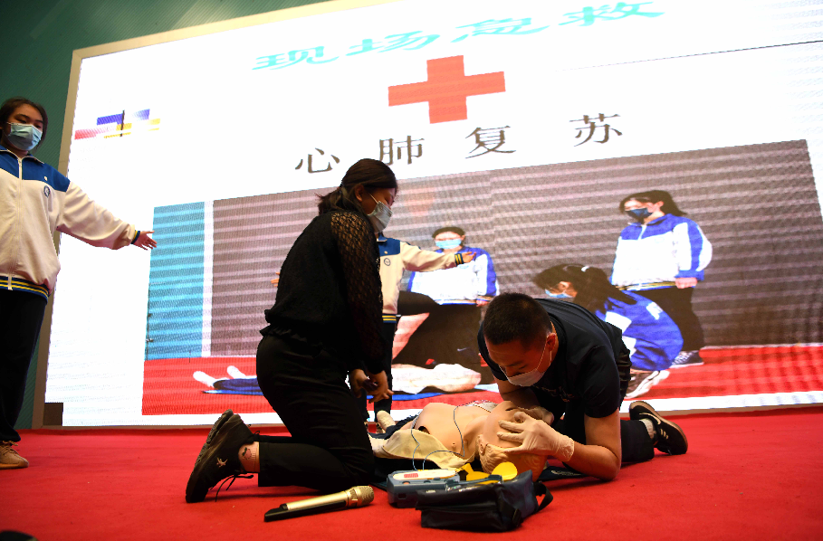课间操跑步结束,丰台二中小屯校区的学生们正陆续回到教室。“有人晕倒了!”学生话音刚落,体育老师已迅速赶到现场,“大家散开,这边的同学去打120,那边的同学去找校医,取来AED(自动体外除颤器)。”听完指令,学生们立即分头行动。