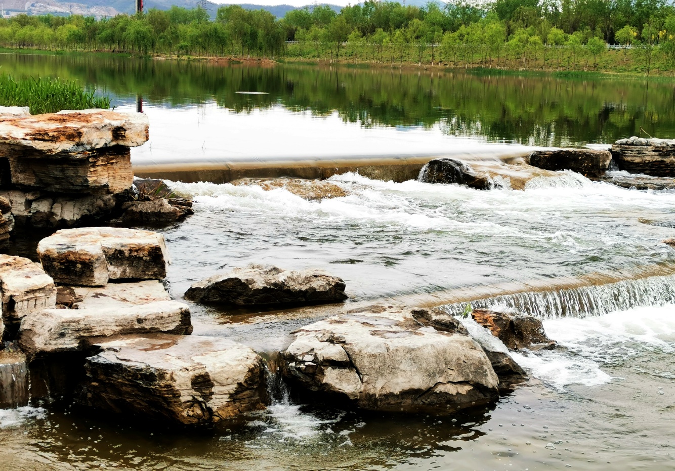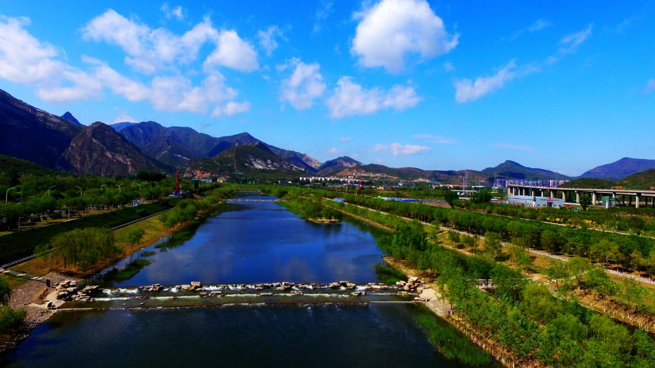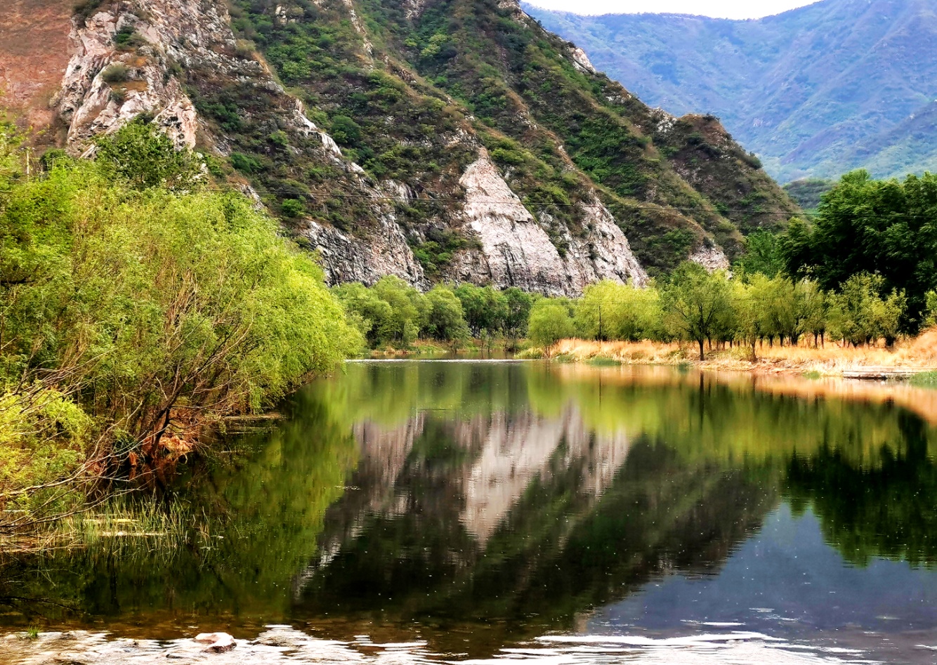 初夏时节,永定河门头沟段两岸绿意葱茏,河水奔流激荡,清澈见底,平缓的地方,山影倒映,形成了一派湖光山色的美景。