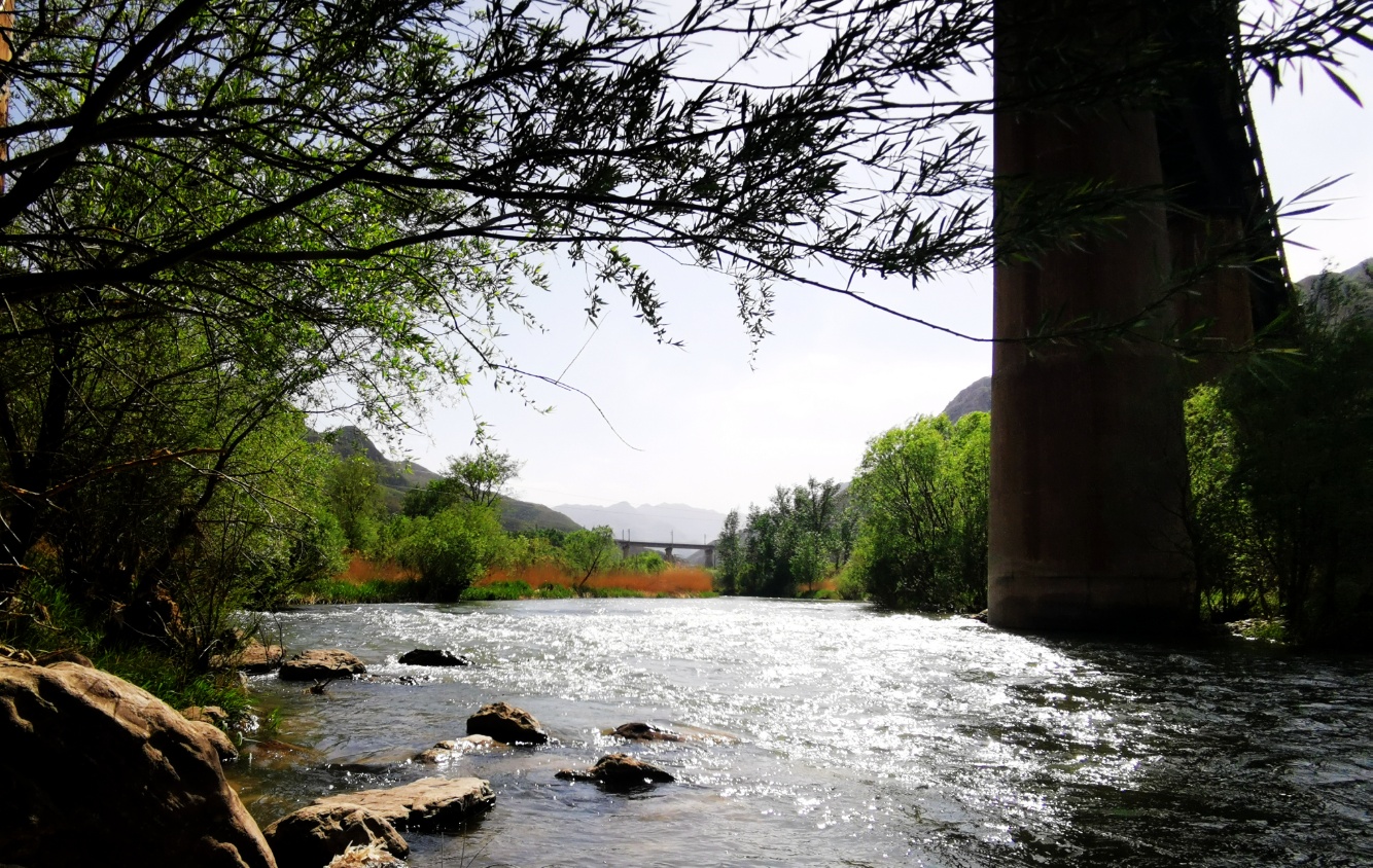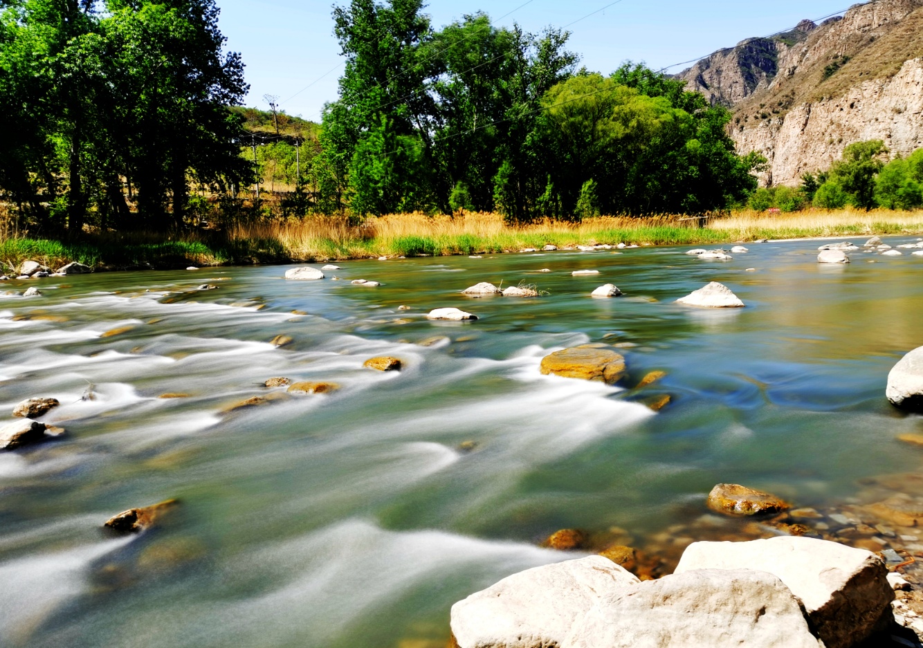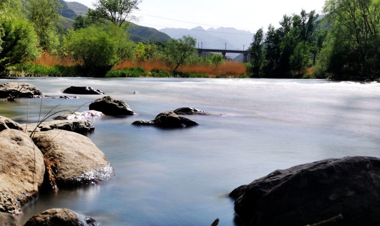 初夏时节,永定河门头沟段两岸绿意葱茏,河水奔流激荡,清澈见底,平缓的地方,山影倒映,形成了一派湖光山色的美景。