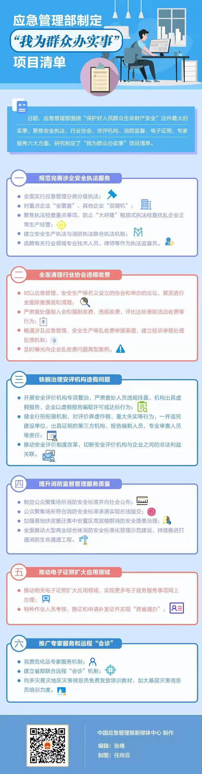 围绕“保护好人民群众生命财产安全”这件最大的实事,近日,应急管理部研究制定了“我为群众办实事”项目清单。记者注意到,21件实事聚焦安全执法、行业协会、安评机构、消防监督、电子证照、专家服务6个方面。各地将全面实行应急管理分类分级执法,减少重复执法;公众聚集场所消防安全标准也将制定,并向社会公布。