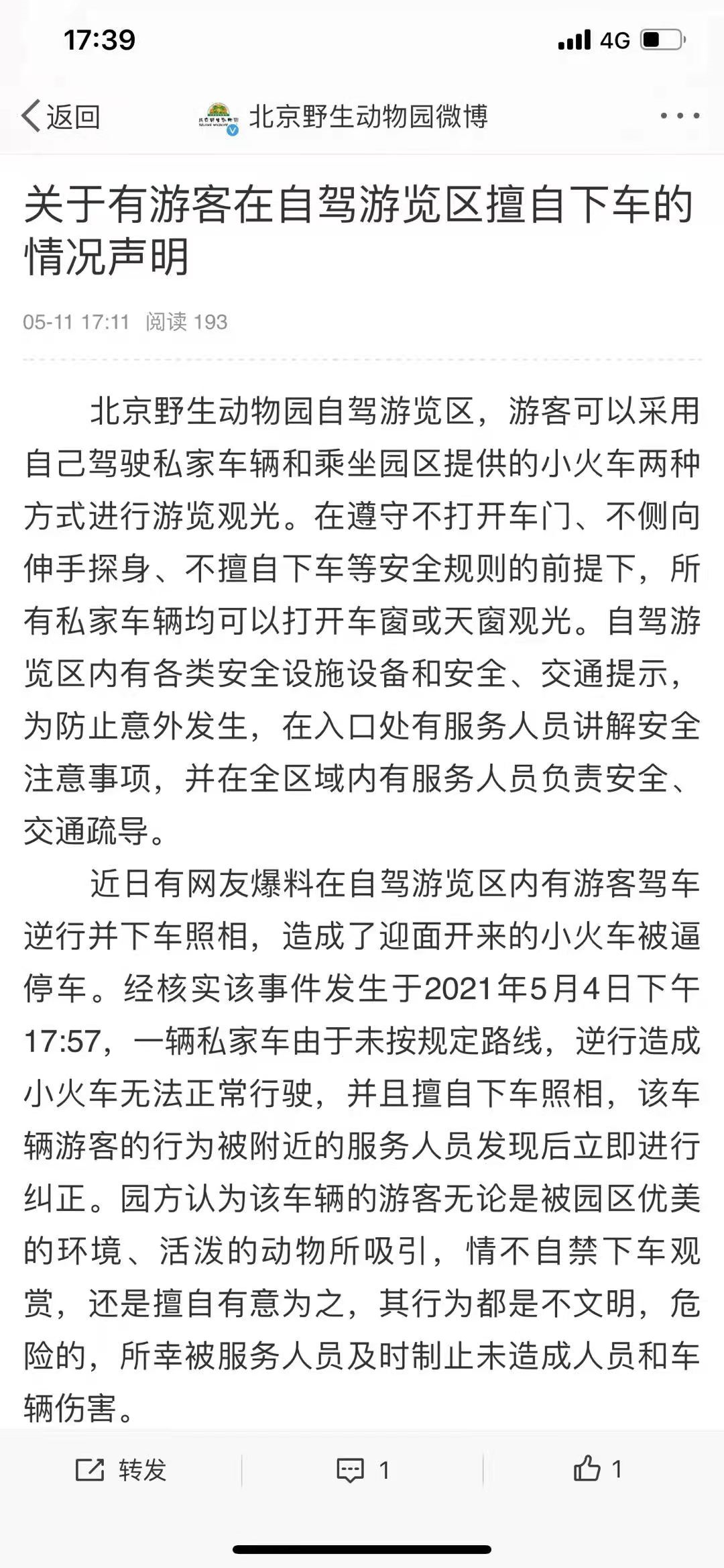 近日,在北京野生动物园自驾游览区,有游客擅自下车拍照,逼停了迎面开来的小火车。今天下午,北京野生动物园在其官方微博发布了《关于有游客在自驾游览区擅自下车的情况声明》。