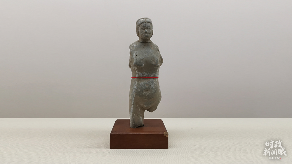 △东汉针灸女陶人。身高24厘米,胸宽7厘米。陶人造型质朴,浑身遍布排列成行的针灸穴位,具有极高的学术价值。(总台央视记者马超拍摄)