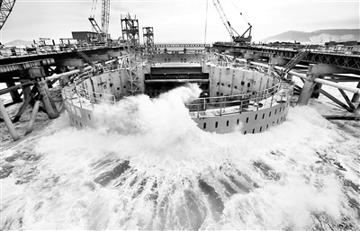 | 巨浪冲击航道桥主墩围堰。 (中铁大桥局供图) |