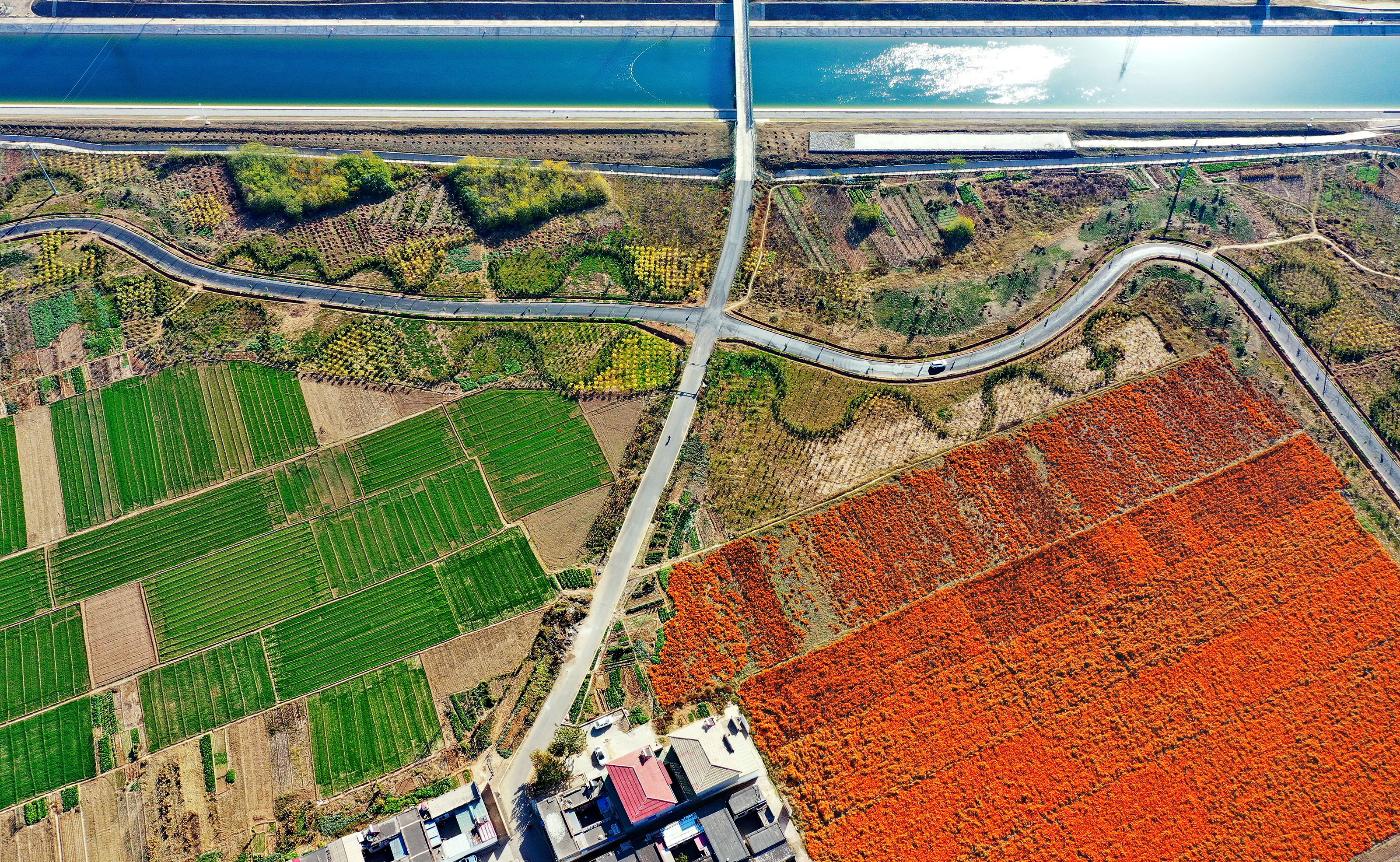 ↑位于河北邯郸境内的南水北调中线干渠及沿岸景色(2019年11月14日摄,无人机照片)。