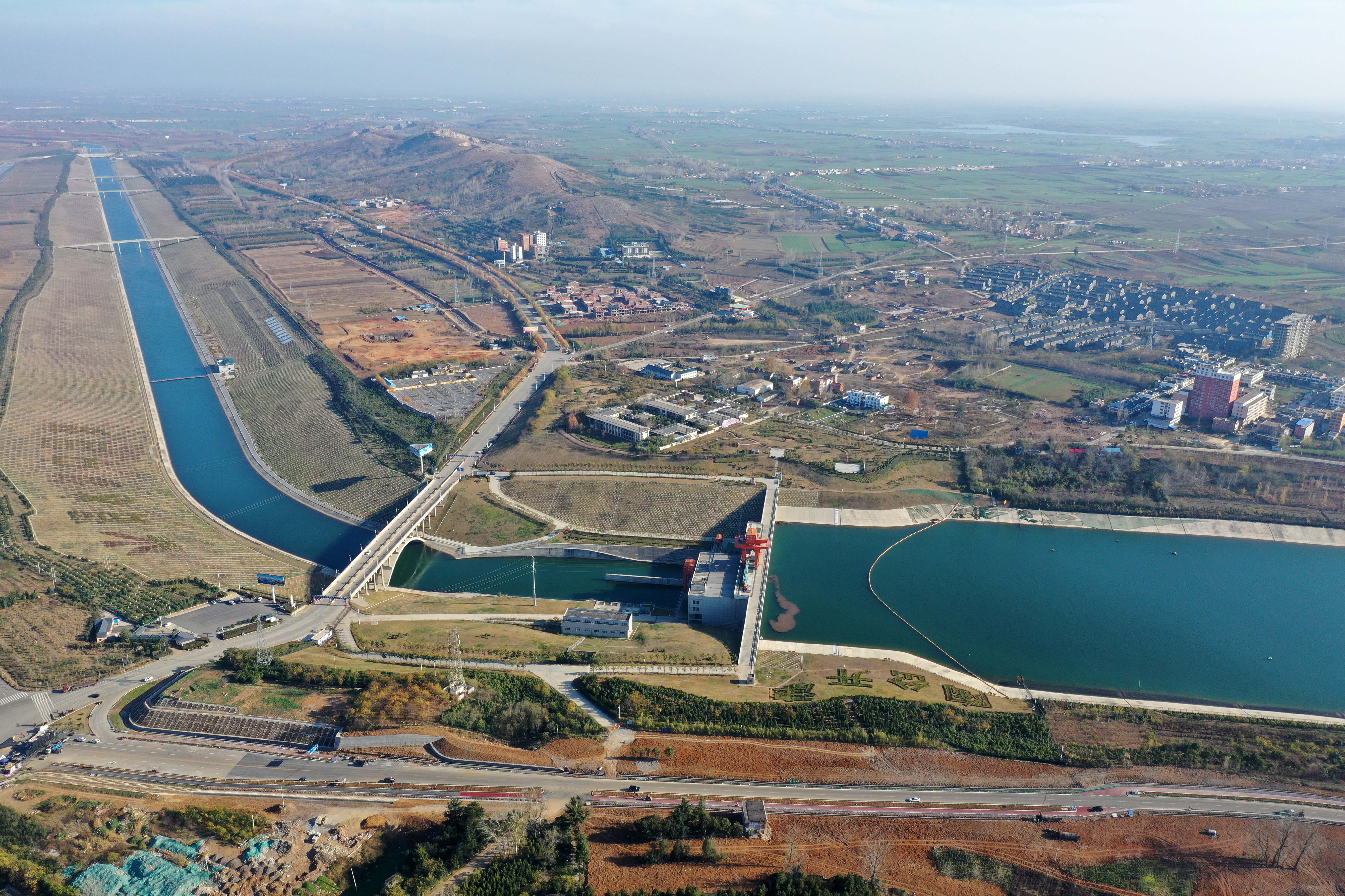 ↑位于山东枣庄的南水北调东线万年闸泵站(2021年3月18日摄,无人机照片)。
