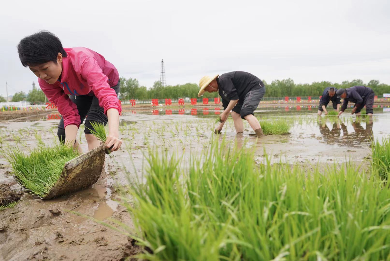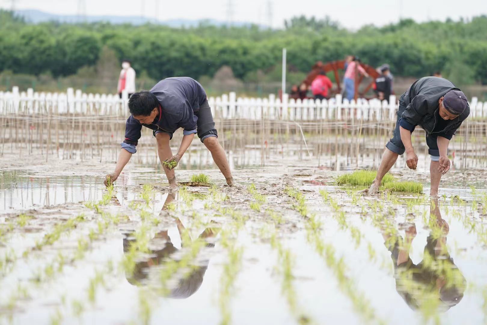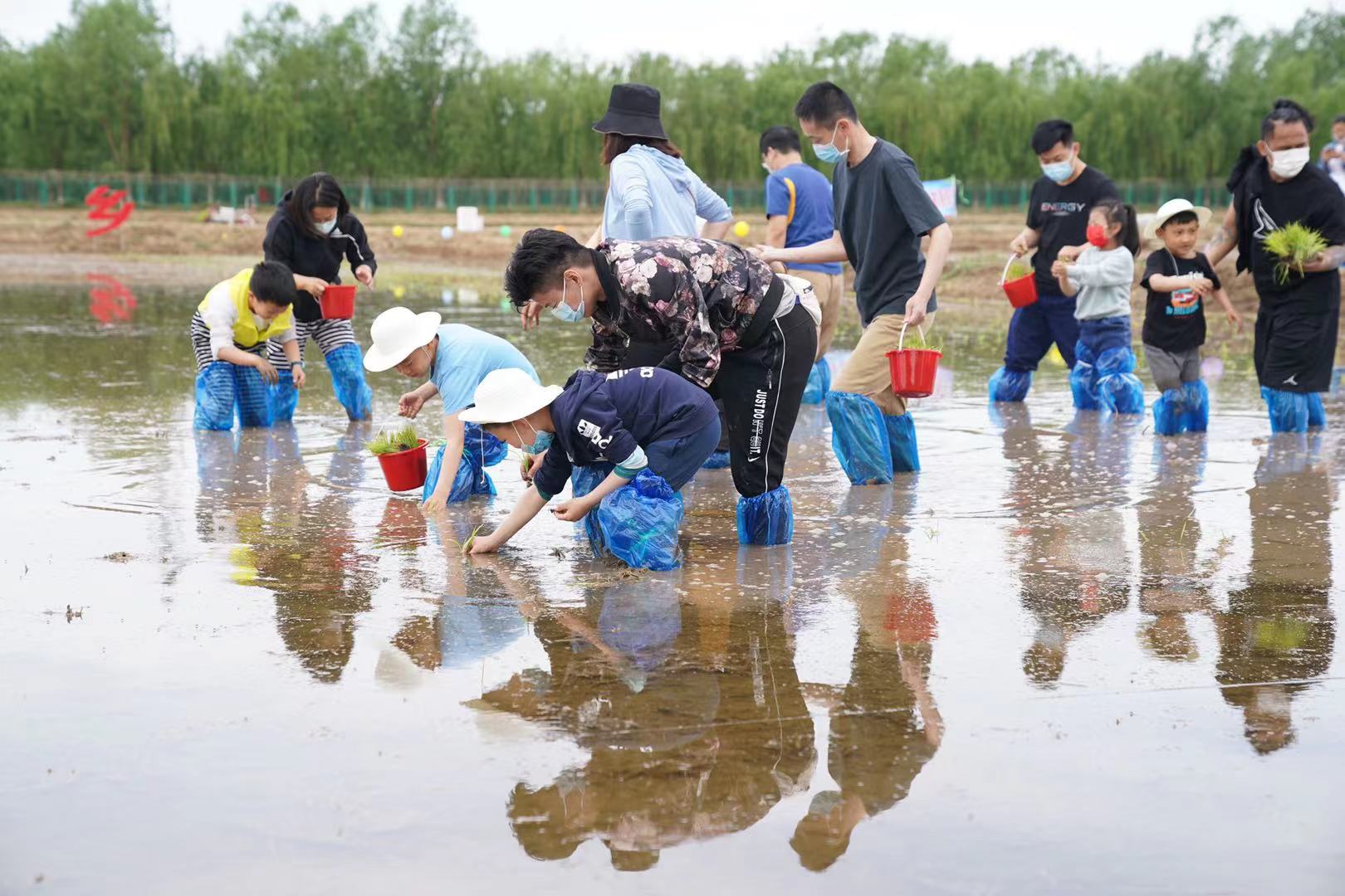 记者在佃起村农业园里看到,农田已经被平整好,也灌满了清水,体验插秧的人们踩进泥泞中,一盘盘水稻放置在水里,等待着扎根更大的空间,成长为稻谷。这边人们弯着腰插秧,那边孩子们玩着稻田套鸭,画着草帽,捏着果蔬彩泥,一派欢乐。