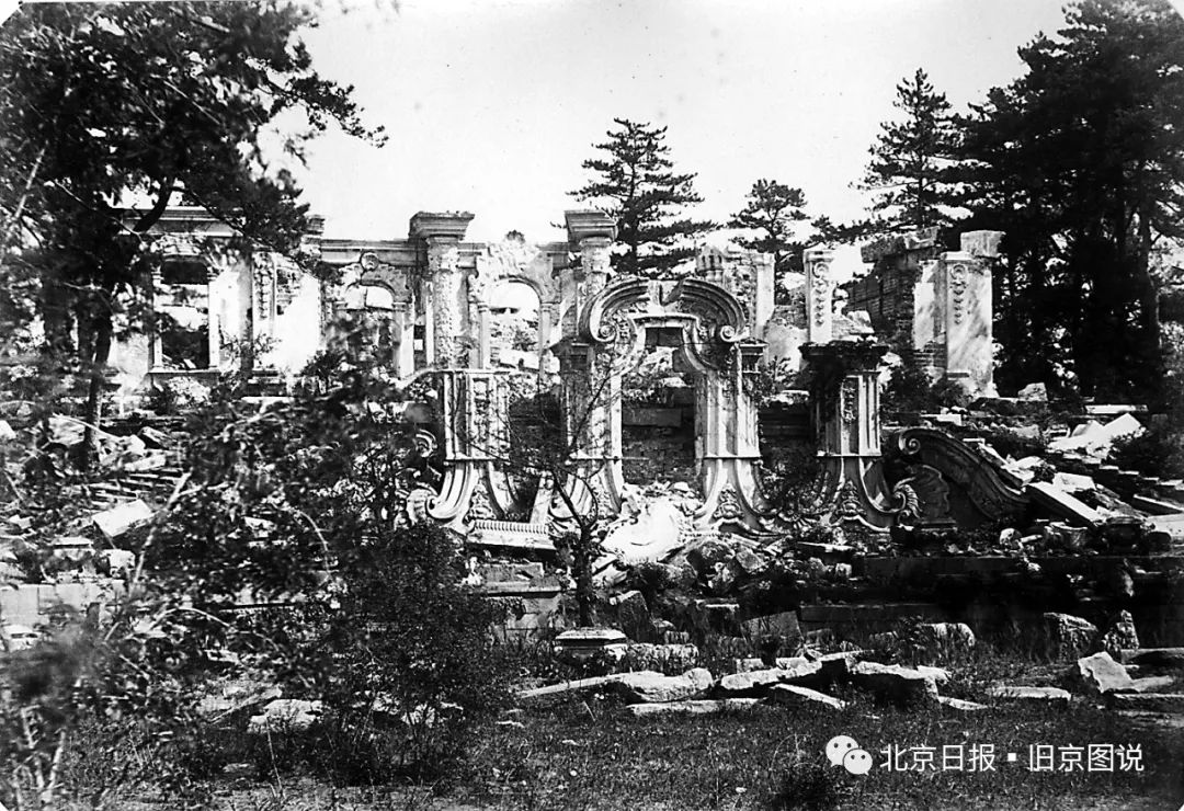 谢满禄在1882年前后拍摄的这张大水法和远瀛观全景,这张照片的拍摄角度和1873年德国人奥尔末的拍摄角度几乎一样,虽然两人拍摄时间相隔只有不到10年,但是大水法和远瀛观已经被破坏得相当严重。
