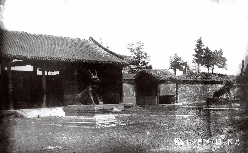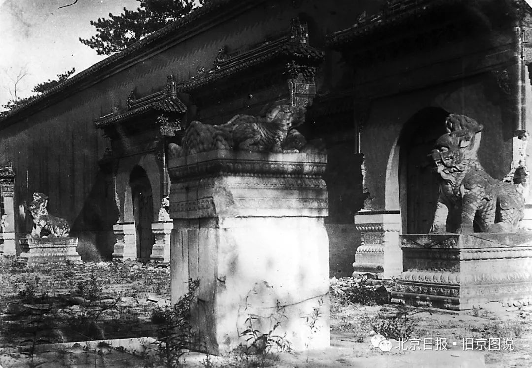 鸿慈永祜,亦称安佑宫,圆明园四十景之一,为清帝御园皇家祖祠,1900年毁于八国联军战乱。谢满禄拍摄四张安佑宫照片,其中三张是宫墙外的,一张宫墙内的。这张安佑宫大门的十分珍贵,照片清晰地记录了安佑宫三券门前的石麒麟,这对石麒麟最早本是有圆明园大宫门前的镇物,后被乾隆移到安佑宫前摆放,上世纪二十年代时,被搬到了燕京大学校园内。这是目前发现的唯一一张拍摄于十九世纪的石麒麟还在安佑宫原址上的照片。