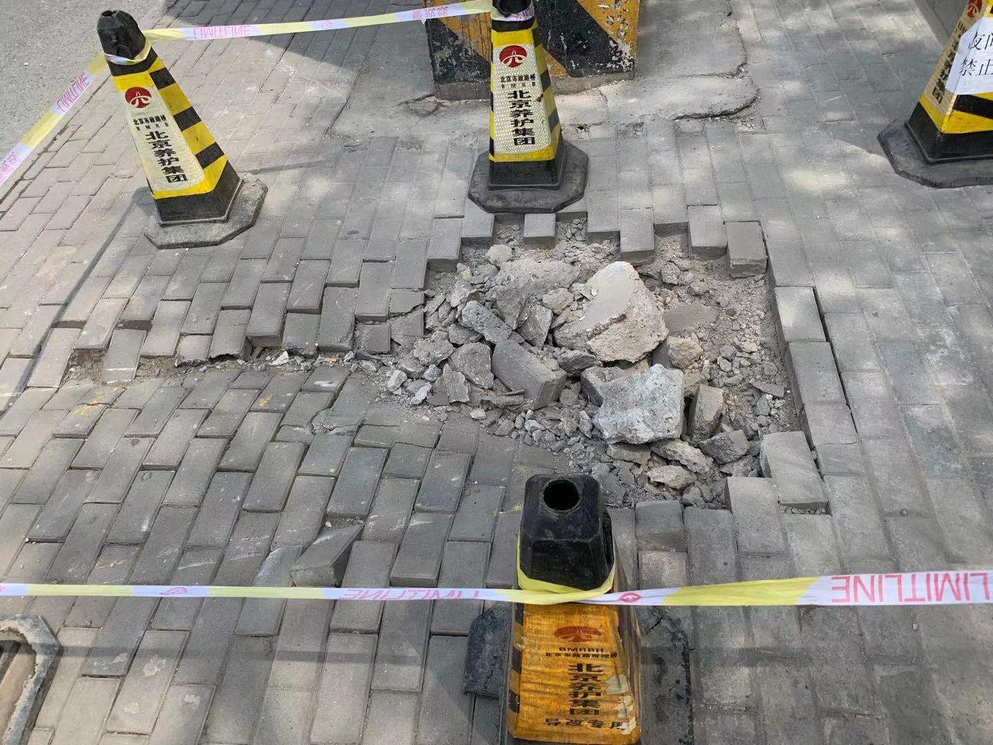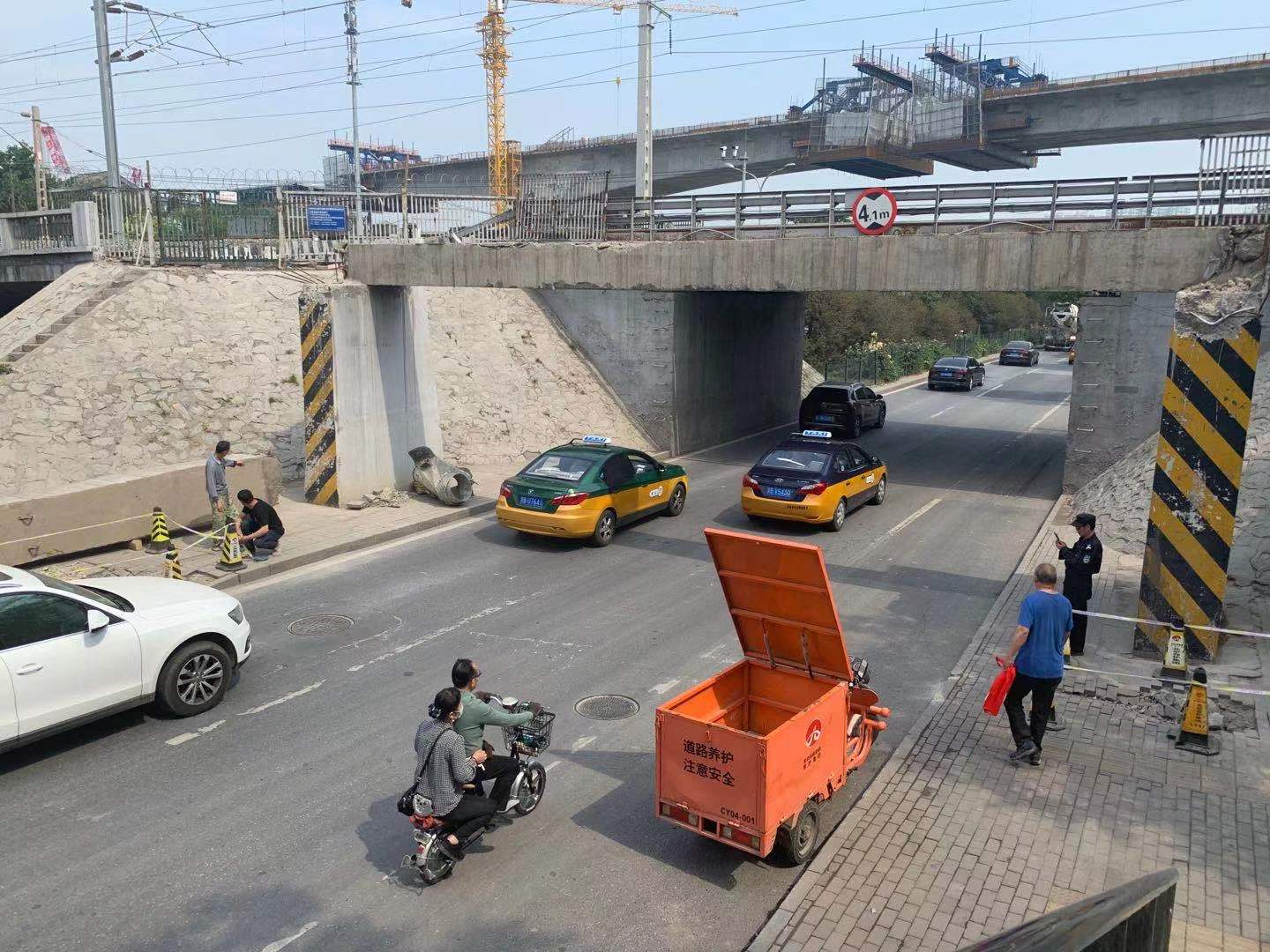 记者看到,掉落的水泥横梁将两侧的人行步道砸出了两个大坑,步道砖碎裂了数块。北京市政路桥养护集团的工人在大坑周围加装了围挡,将尽快进行修复地面大坑。