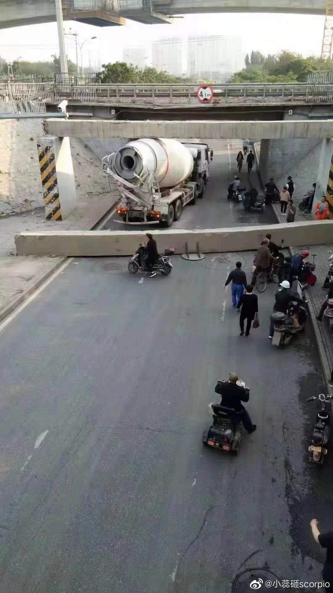 5月19日清晨,一辆水泥罐车在经过京港澳高速进京方向西道口辅路时,因超高撞断了4.1米高的水泥限高架,被卡在限高架下。断落的限高架阻断了道路,造成了早高峰车辆严重拥堵。目前,断落的限高架已被移开,道路已恢复畅通。
