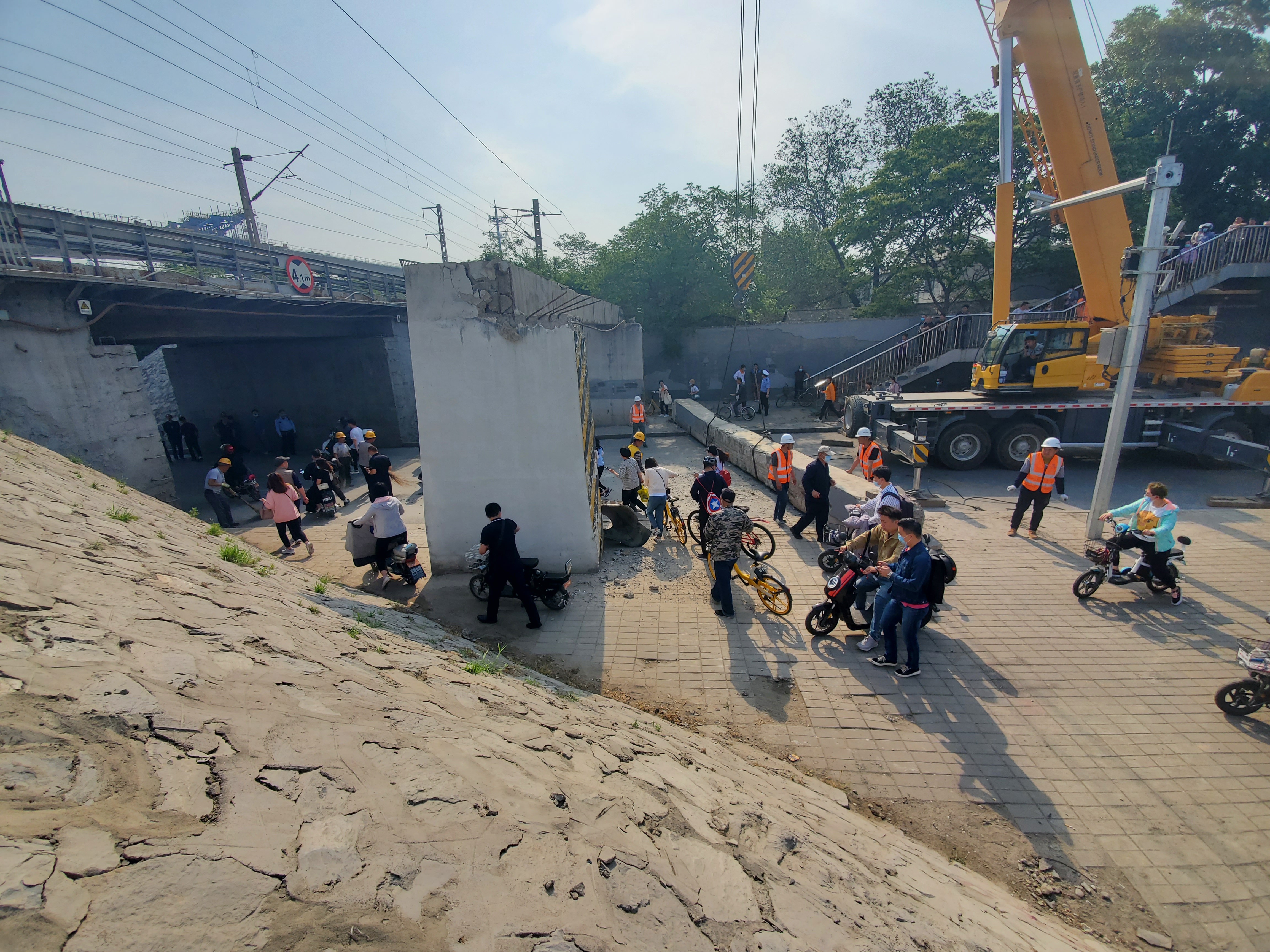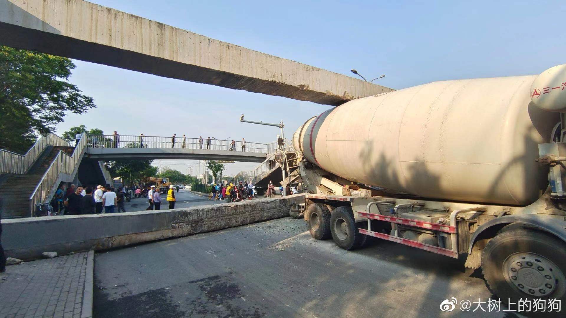 上午9时30分,记者赶到西道口辅路的事故现场时,只见断落的约14米长的水泥横梁已经被吊到了路侧的人行道上,水泥罐车上被撞掉的进物斗也被挪到路边。道路已经被清理干净,肇事的水泥罐车放了轮胎气后也驶离了现场。