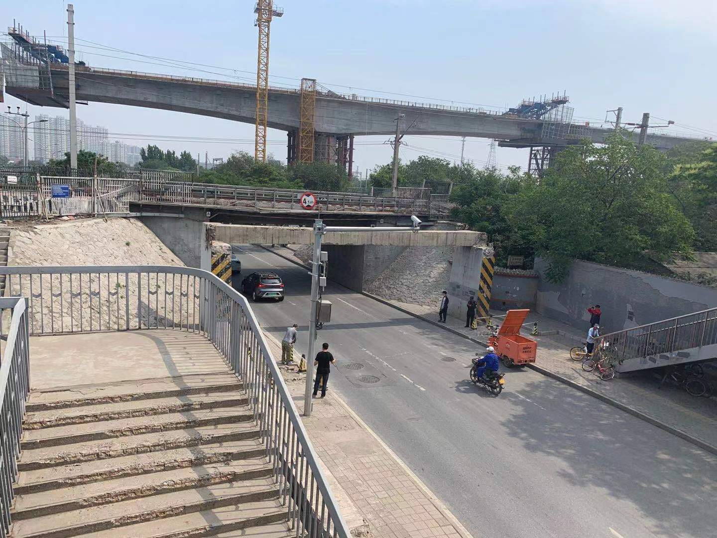卢沟桥办事处派来了两名保安人员在路两侧看护安全。一名保安告诉记者,事故现场大约在上午8点45分清理完毕。事故发生后,铁路部门紧急调配附近的吊车,将断落的水泥横梁吊移到了路侧不影响车辆通行的位置。