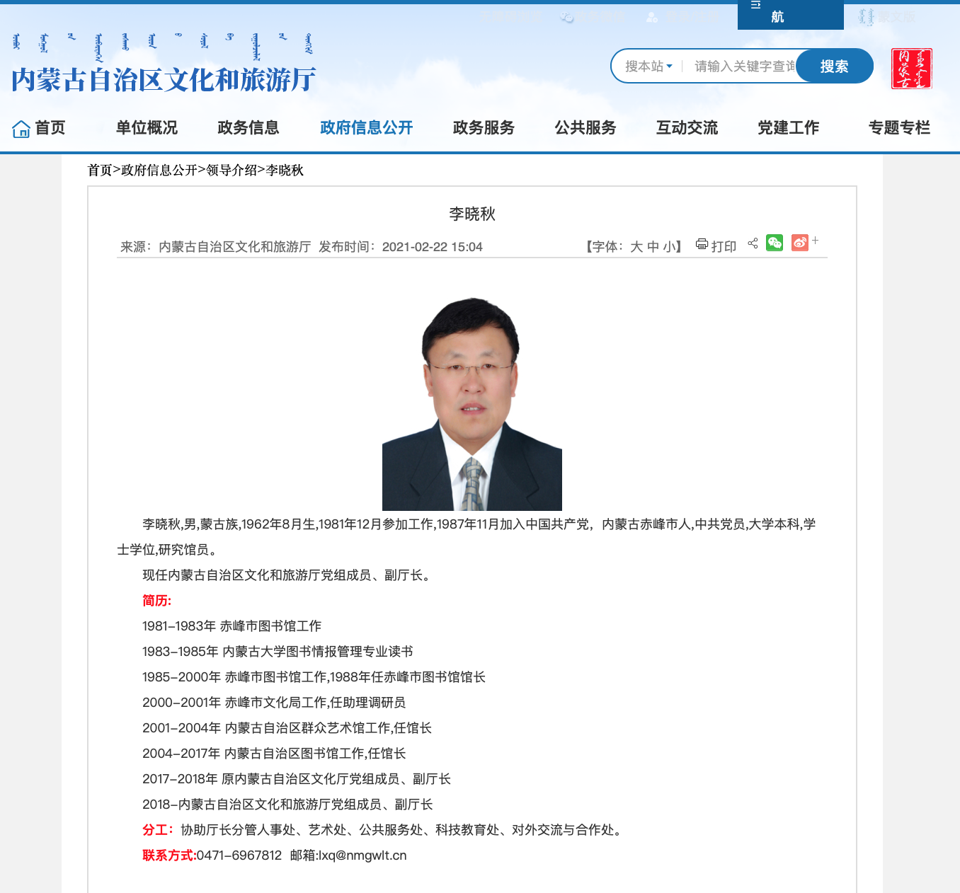 据新华网5月19日消息,内蒙古自治区文化和旅游厅党组成员、副厅长李晓秋已自杀身亡。原因不详。