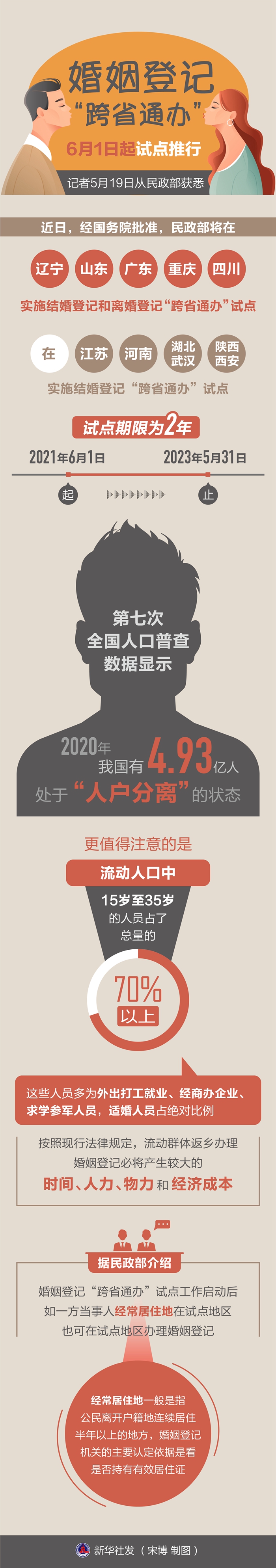 新华社北京5月19日电(新华社记者高蕾、孙少龙)婚姻,是人生中的一件大事。作为确认婚姻关系过程中的重要一环,婚姻登记必须在一方户籍地办理的规定,多年来让不少外出工作、生活、学习的人深感不便。