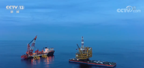 中国海油陆丰油田群区域开发项目总经理 高爽:平台分上部组块和导管架两部分。在起伏不定的茫茫大海中,将平台上部组块与163米高的“支架”精准对接,而且误差不能超过5毫米,其技术难度堪比飞船与空间站的对接。
