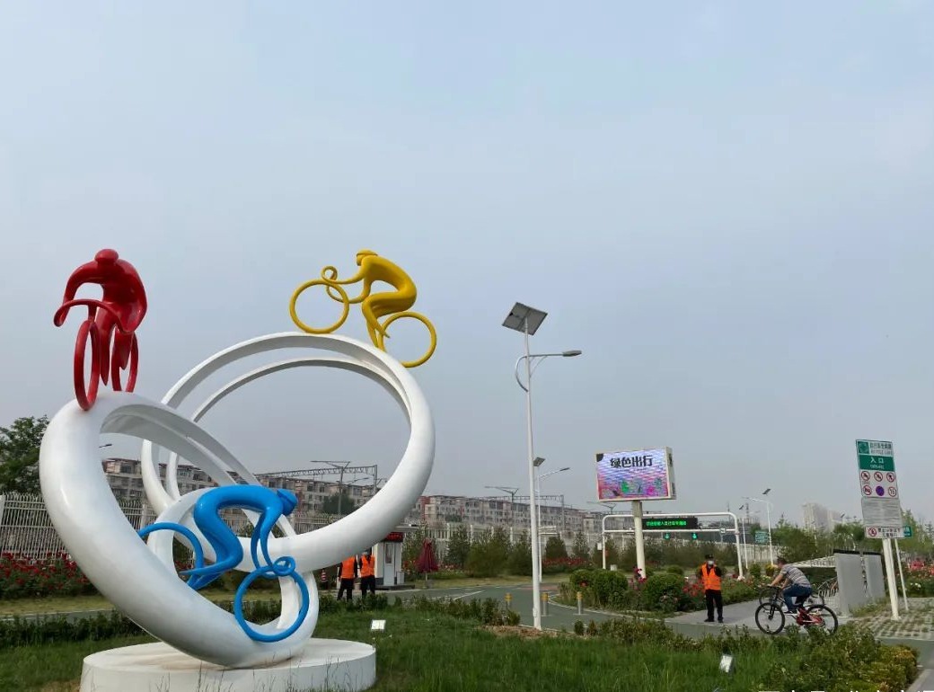 为进一步提升自行车专用路辨识度,倡导绿色出行新风尚,昌平区在自专路起点位置设立了《健康之行》主题雕塑。雕塑运用无限循环的“莫比乌斯环”作为主体,寓意绿色出行形式成为城市的“良性”循环,抽象化“三原色”骑行人物运用象征了生活的多彩和世界美好。下一步,昌平区城管委将进一步完善管理规范、细化标准要求,加大文明出行宣传引导,将自专路打造成为北京乃至全国的绿色交通体系建设的样板工程。