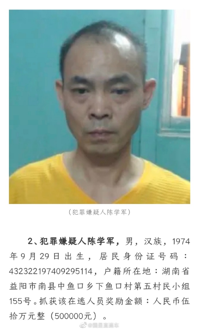 三亚市公安局近日发布悬赏通告,陈志军、陈学军因涉嫌黑恶犯罪在逃,警方悬赏人民币一百万元,抓获一名即奖五十万。发现在逃人员请及时联系经办警官(尹警官13637675198、魏警官18189889712)或拨打110报警。2名逃犯身份信息↓