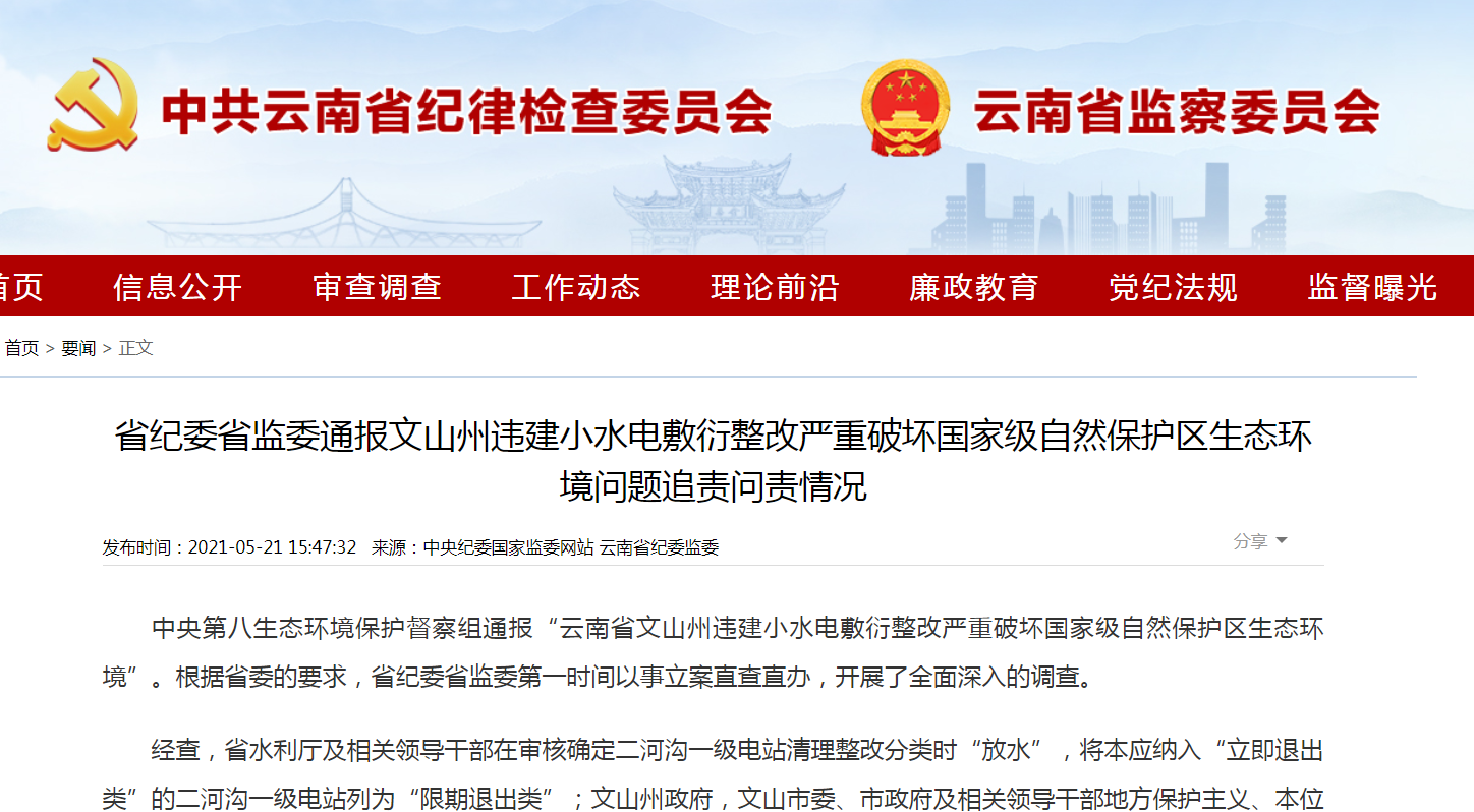 5月21日,云南省纪委监委官网消息:云南通报文山州违建小水电敷衍整改严重破坏国家级自然保护区生态环境问题追责问责情况。