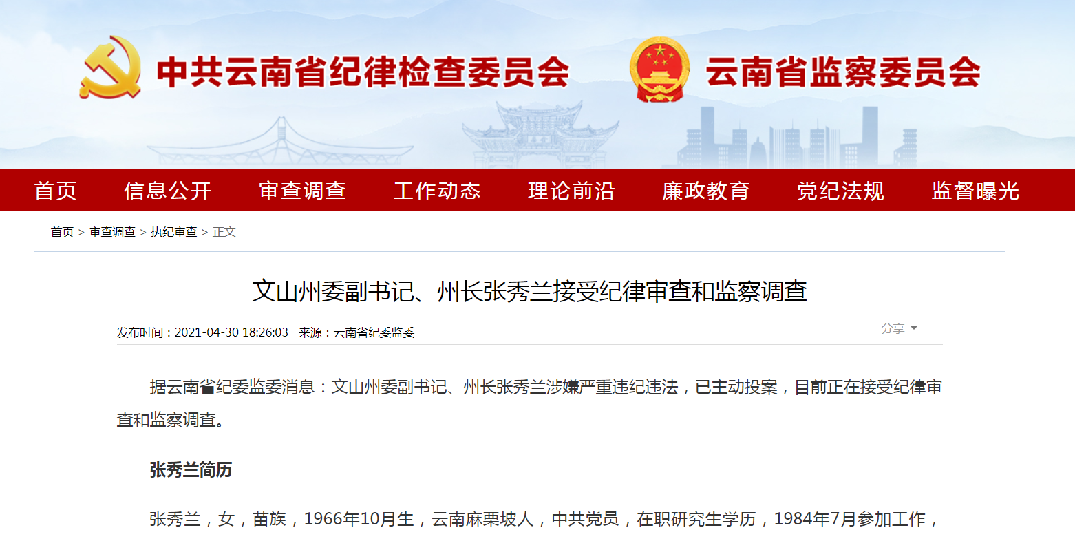 记者注意到,20天前,4月30日,云南省纪委监委官网通报了张秀兰“落马”的消息。