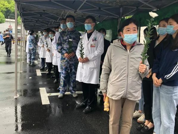 东方肝胆外科医院3号楼外搭建了一处临时悼念灵堂。23日上午9时许,澎湃新闻记者看到灵堂外排起长队,人们手捧鲜花,对吴老做最后的告别,向遗照鞠躬、敬礼,慰问吴孟超的家属。