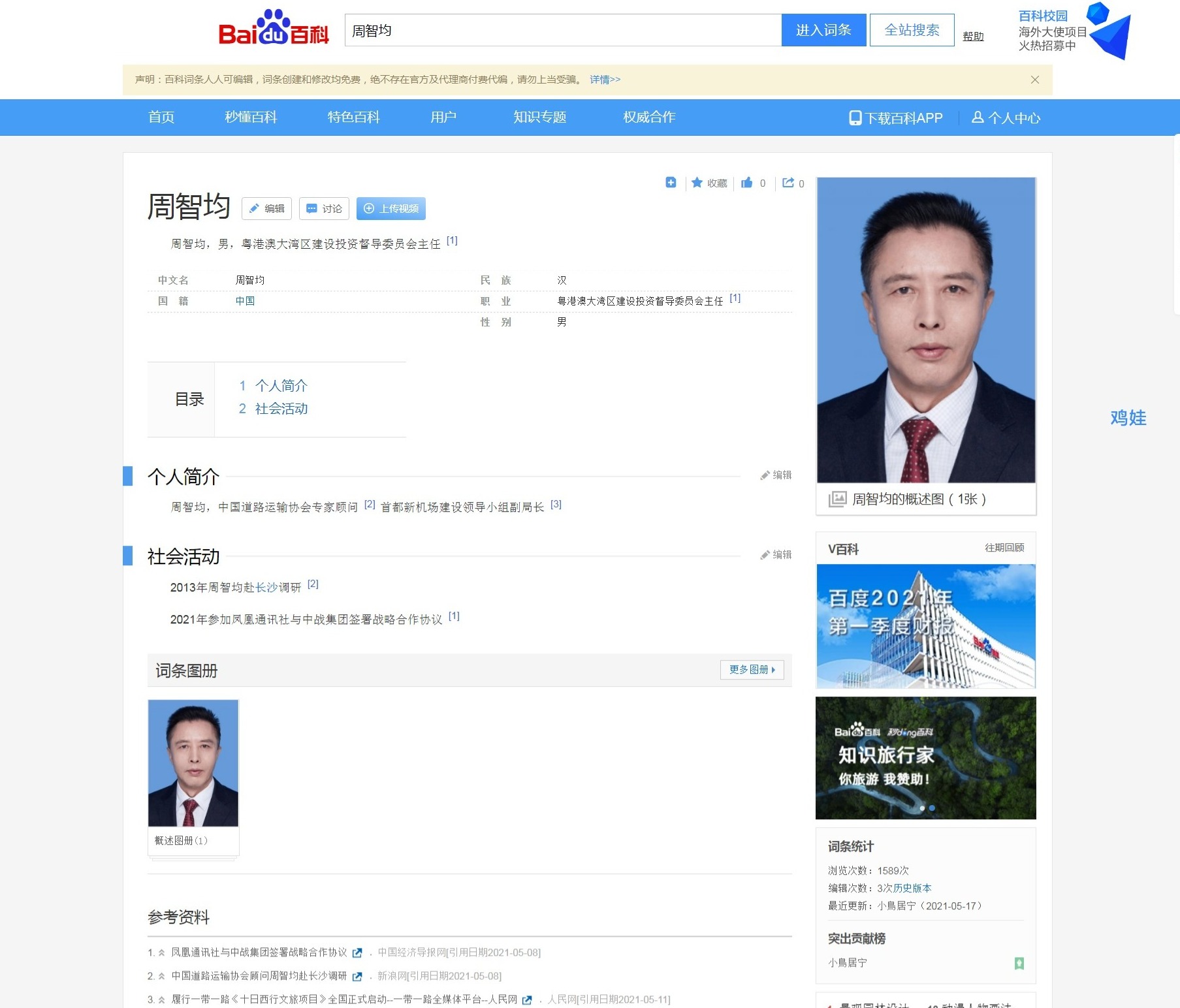 在百度百科上,这名叫周智均的人士不仅是“粤港澳大湾区建设投资督导委员会主任”,还是“中国道路运输协会专家顾问”“首都新机场建设领导小组副局长”。而在2013年一则报道中,顶着“中国道路运输协会专家顾问”名头的周智均还被标注为“国务院办公厅同志周智均”。