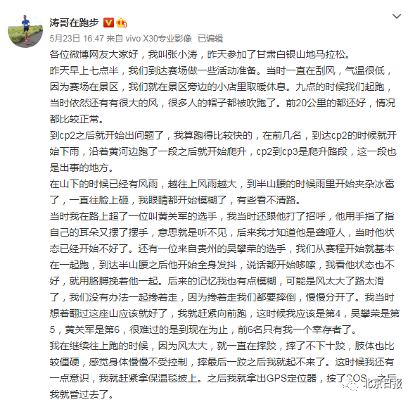 5月23日下午,参加了此次比赛的张小涛在社交网络发帖,讲述了自己的亲身经历。他写道,起跑时风很大,越往上风雨越大,到半山腰时雨里开始夹杂冰雹了。自己一路上遇到了黄关军、吴攀荣等选手,后来因风太大、路太滑而慢慢分开。最后自己在山上昏迷,所幸被放羊的牧民所救,将他扛到了窑洞里,才得以幸存。“很难过的是到现在为止,前6名只有我一个幸存者了。 ”
