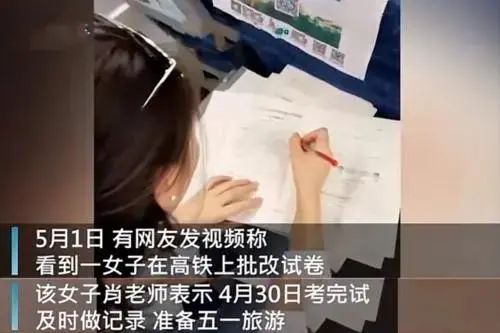 五一前夕,在衡阳到福田的高铁上,网友看见一位女教师在认真批改试卷, 便顺手拍下这一幕发到了网上。