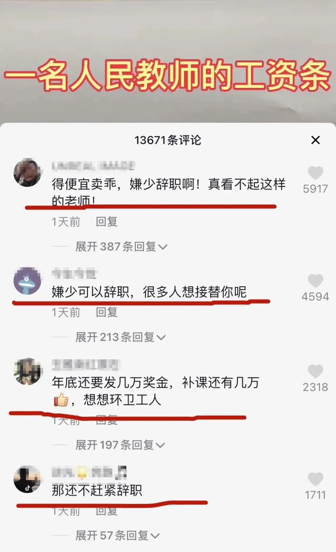 不久前,抖音上一名教师晒出月薪3000元的工资条引发热议。评论区里1.4万多的评论,几乎是清一色对教师的嘲讽和抨击: