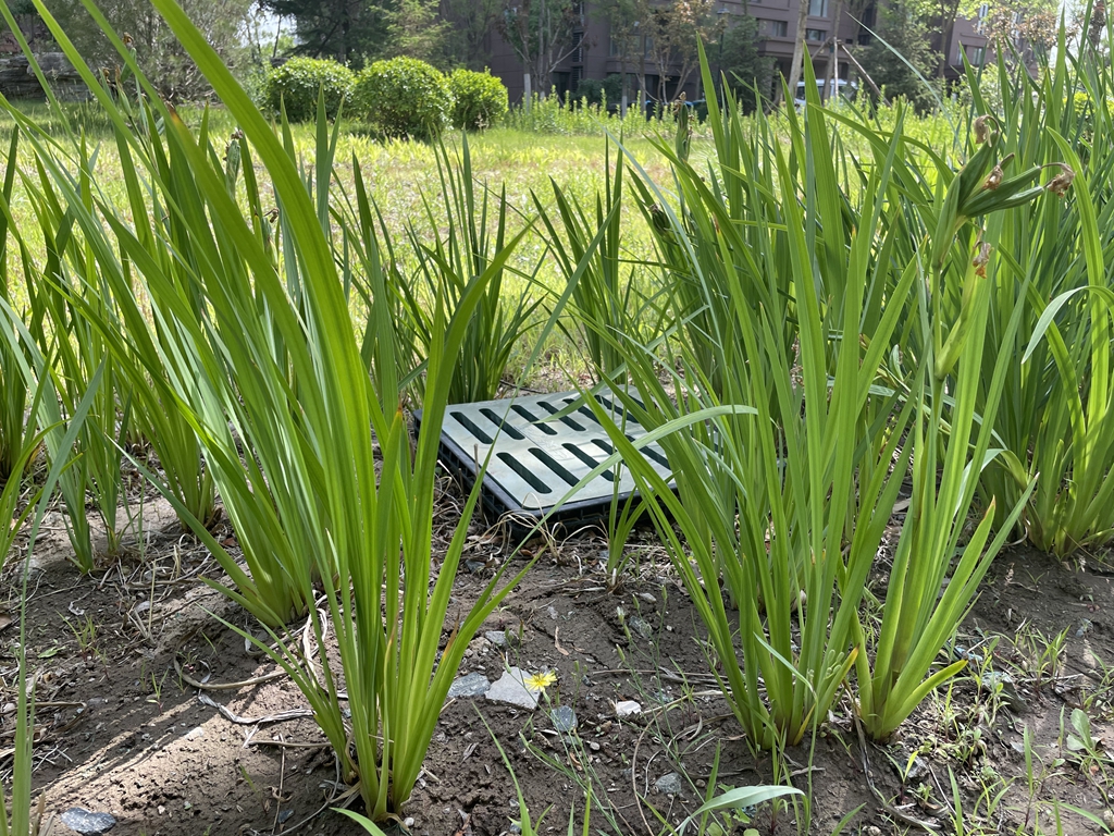 紫运南里二区中心位置,一大片高低错落的植株在微风中摇曳生姿。细看绿地边缘,比紧邻的人行步道要矮上一截,方便路面径流向低流入,这便是小区的“生物滞留池”了,它还有个更生动好听的名字“雨水花园”。