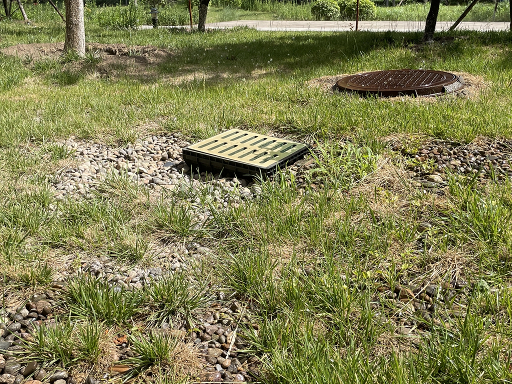 雨水花园同样采用多层结构,最上层是种植土,然后是细沙、砾石,砾石层内置有渗管。此外,雨水花园内地形较高处还设有溢流井,只有雨量过大,超出绿地蓄水能力,水才会“漫”到井沿高度,流入市政管网。