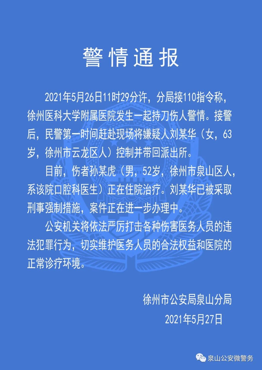 目前,伤者孙某虎(男,52岁,徐州市泉山区人,系该院口腔科医生)正在住院治疗。刘某华已被采取刑事强制措施,案件正在进一步办理中。