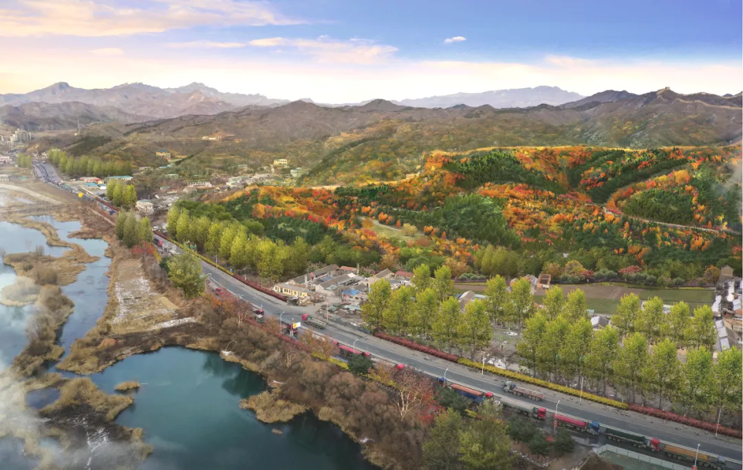 蓝绿生态段绿化面积490.2亩,位于古北口镇,该段道路与潮河河道并行,蓝绿交织,建设后将助力实现廊道功能互通、生态和谐。
