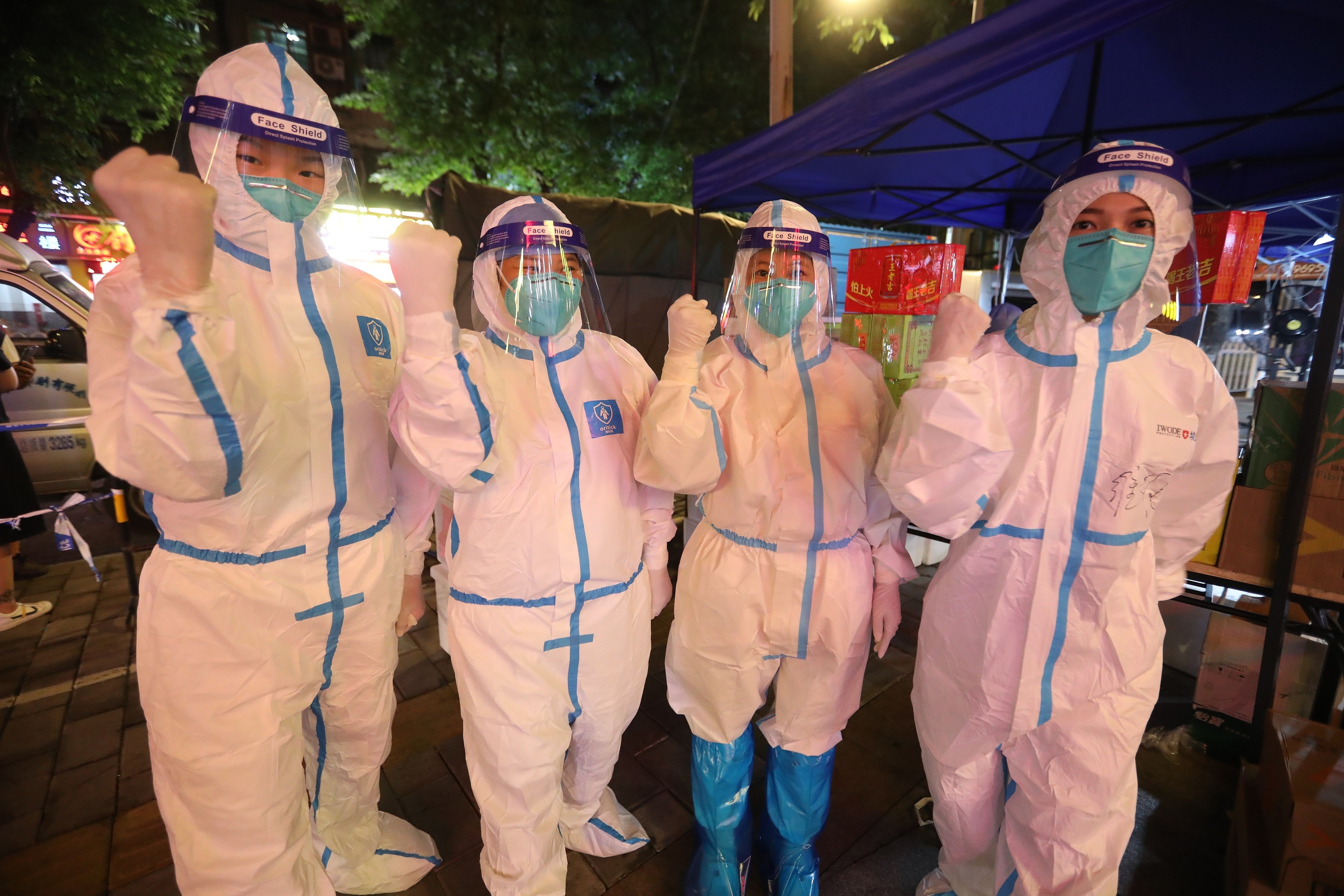 广州核酸检测现场,4名护士换好隔离服,准备换岗。图片来源:视觉中国
