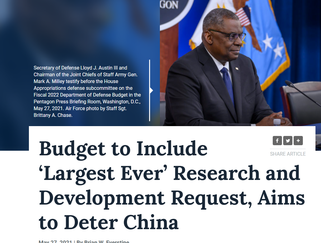 首先,增加军费是为了保持美国的霸主地位,或者说是“全球主导地位”。而对付中国,日渐成为其中的一项主要任务。