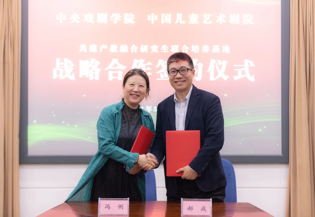 5月31日,中国儿童艺术剧院院长冯俐与中央戏剧学院院长郝戎签署双方首份《共建“产教融合研究生联合培养基地”战略合作协议》,标志着作为中国儿童青少年戏剧的“国家队”——中国儿童艺术剧院与中国戏剧最高学府——中央戏剧学院联手,率先打造“产教融合”新模式。